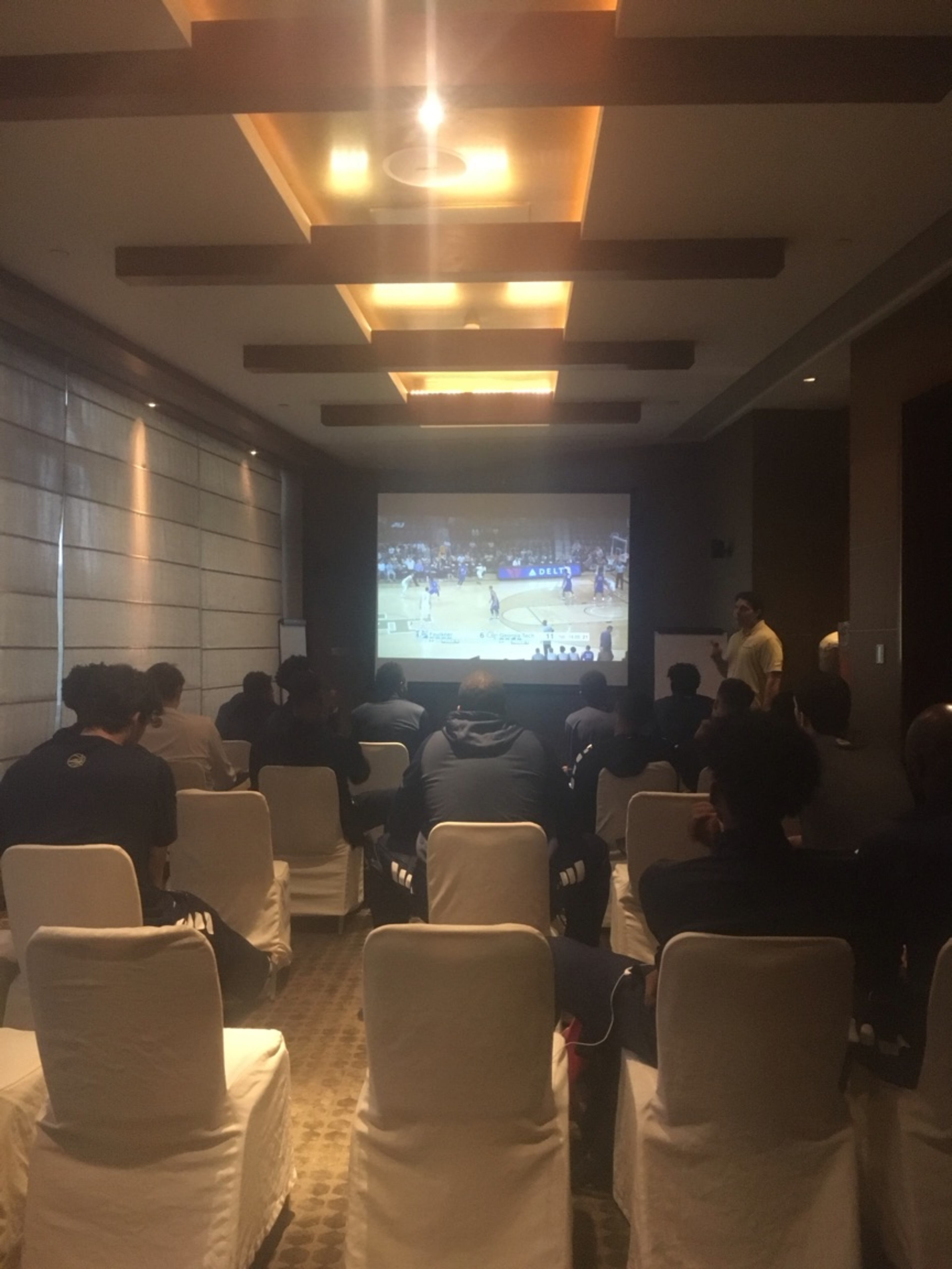 A somewhat more formal team picture with Alibaba co-founder Joe Tsai (holding jersey) at the campus of the e-commmerce giant in Hangzhou. This was just after Tsai had asked of center Ben Lammers, "You attack the rim, right?"