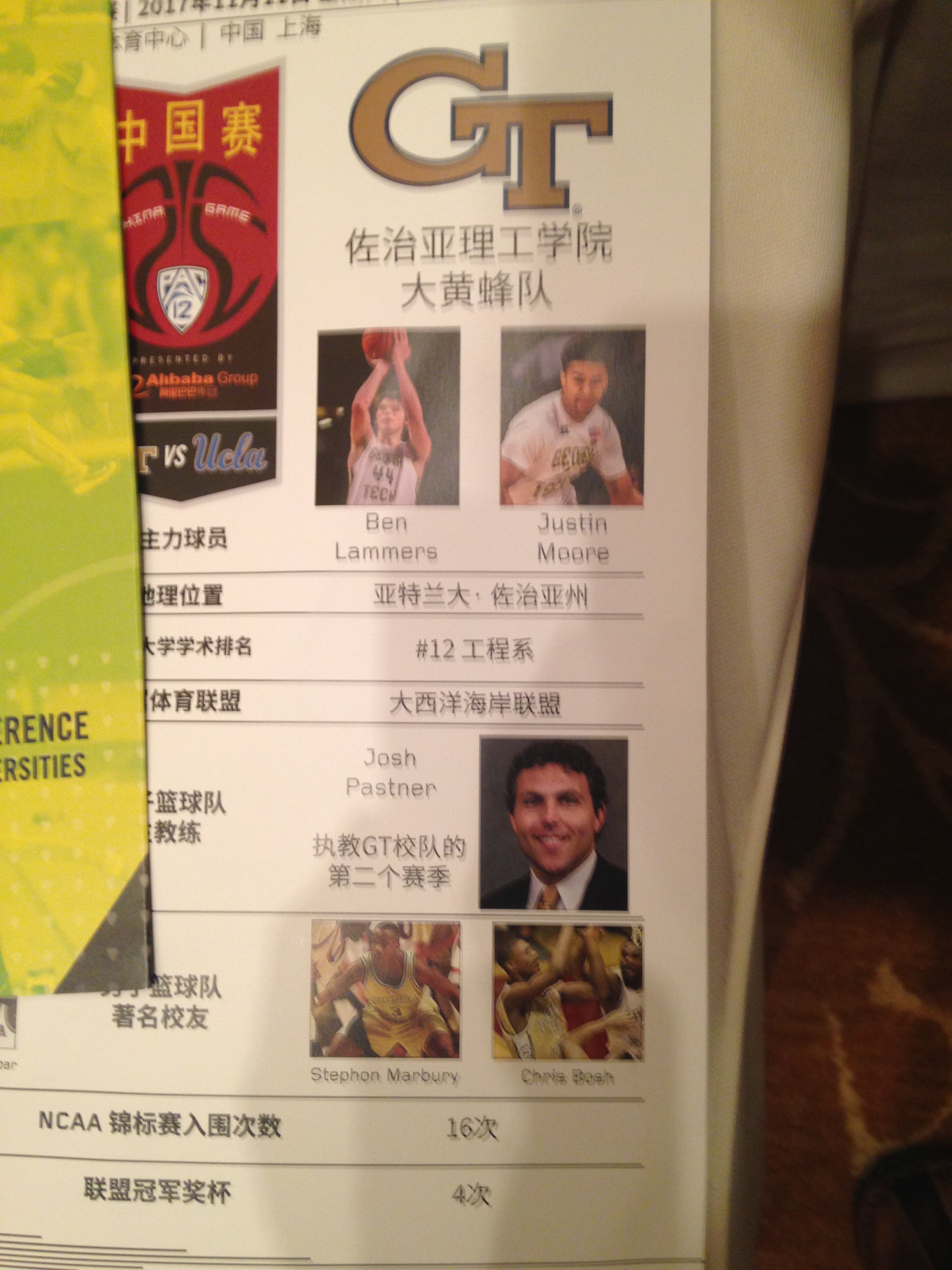 Part of the media notes for Saturday’s game. At the news conference, held at Shanghai Disney, there were perhaps 15 or 20 local reporters on hand. Besides Lammers and Pastner, UCLA coach Steve Alford and guard Aaron Holiday also spoke. The primary speakers were Pac-12 commissioner Larry Scott, Dazhong Zhang (CEO of Alisports, the sports arm of the e-commerce company Alibaba) and XUE Yanqing (secretary general of the Federation of University Sports of China).