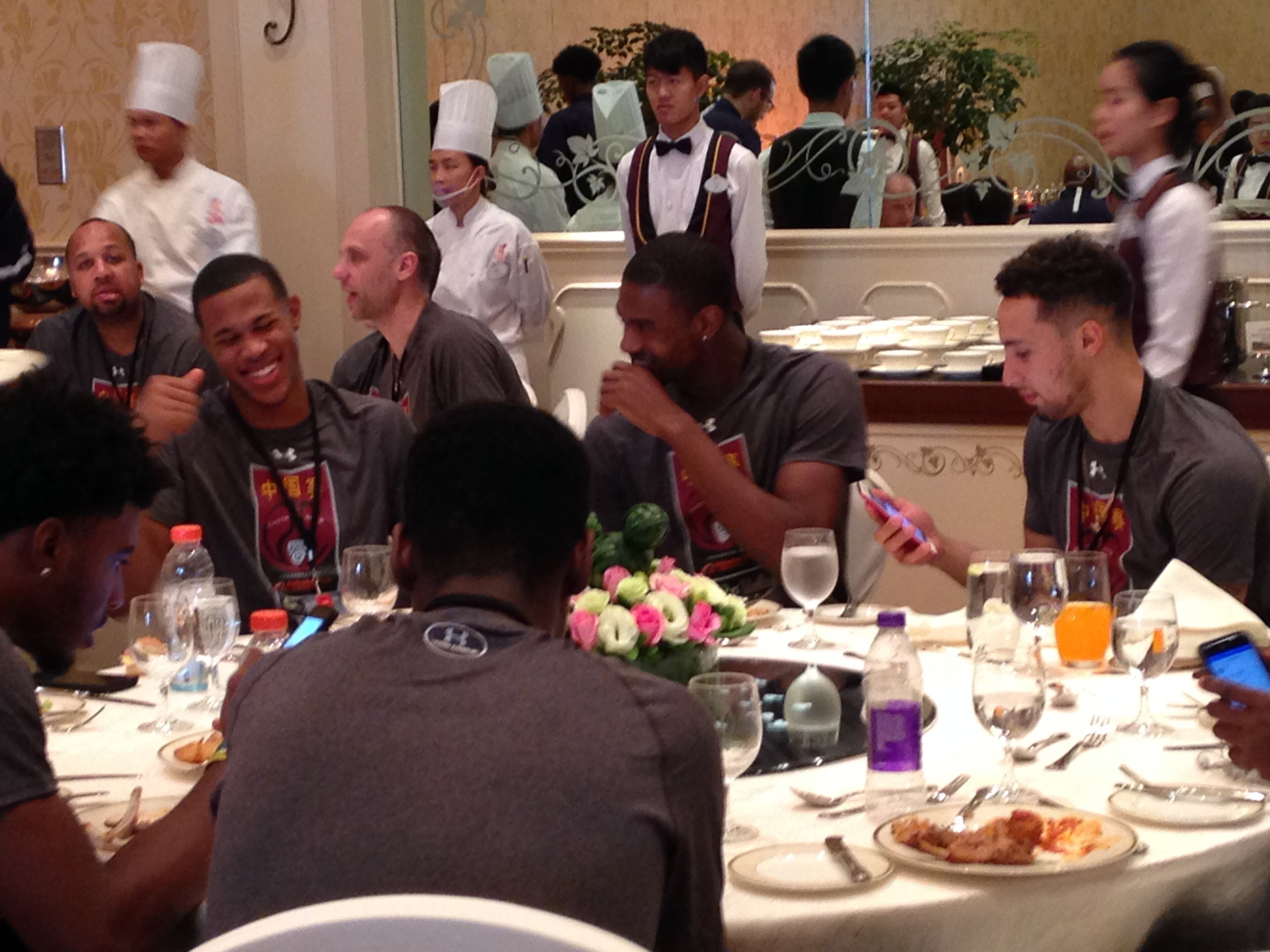 Tech players enjoying a laugh during lunch at the Disney Shanghai Resort. Particularly amused is freshman walk-on Evan Jester.