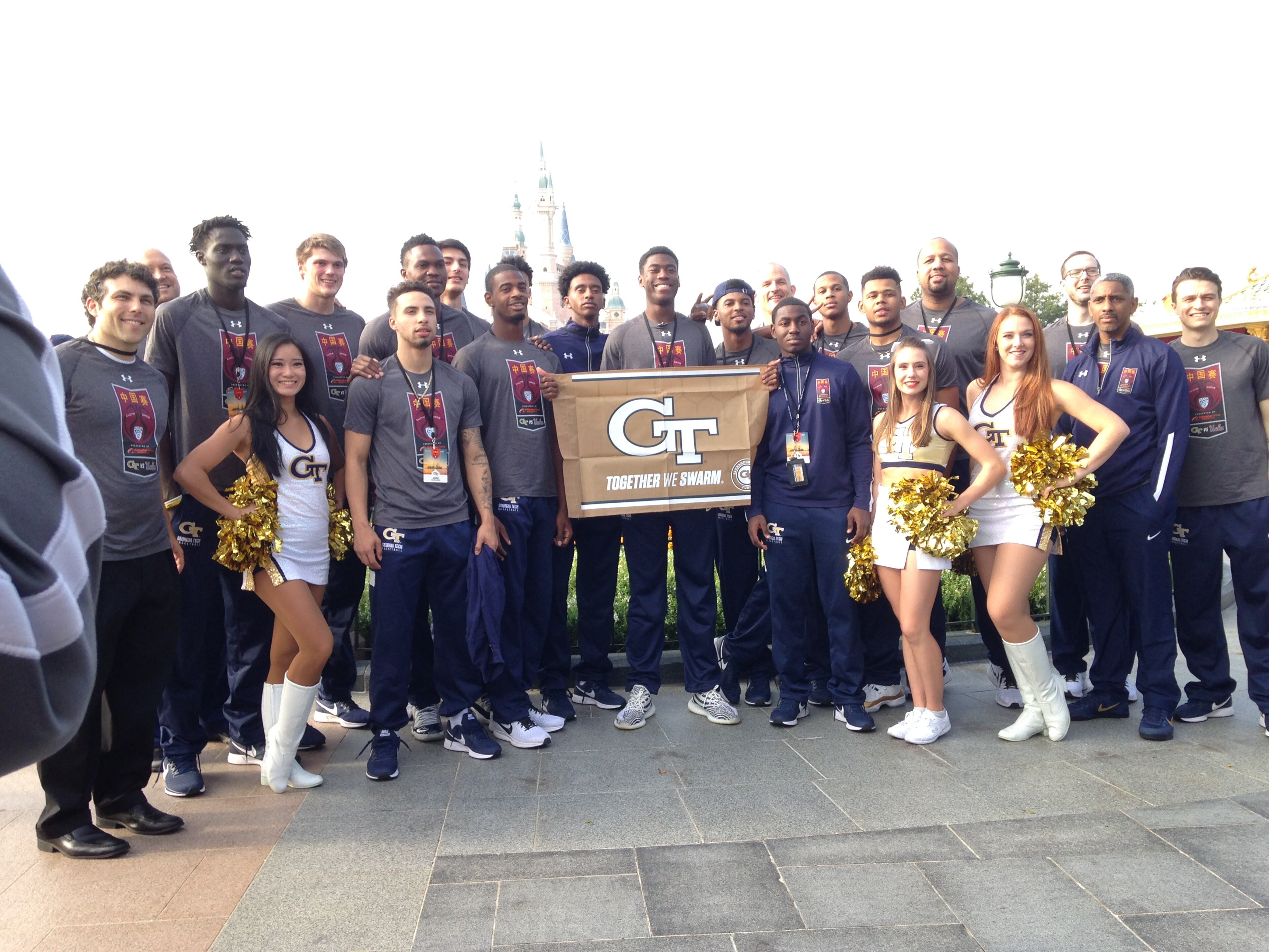 Tech players, coach, staff and cheerleaders pose in front of the Disney castle. The team spent about 3 ½hours in the park before returning to the team hotel. Pastner was mildly interested in the excursion, going on the Pirates of the Carribean ride (in the same boat with a much more enthused Steve Alford) before eventually going back to the team bus to get his laptop to watch game video.