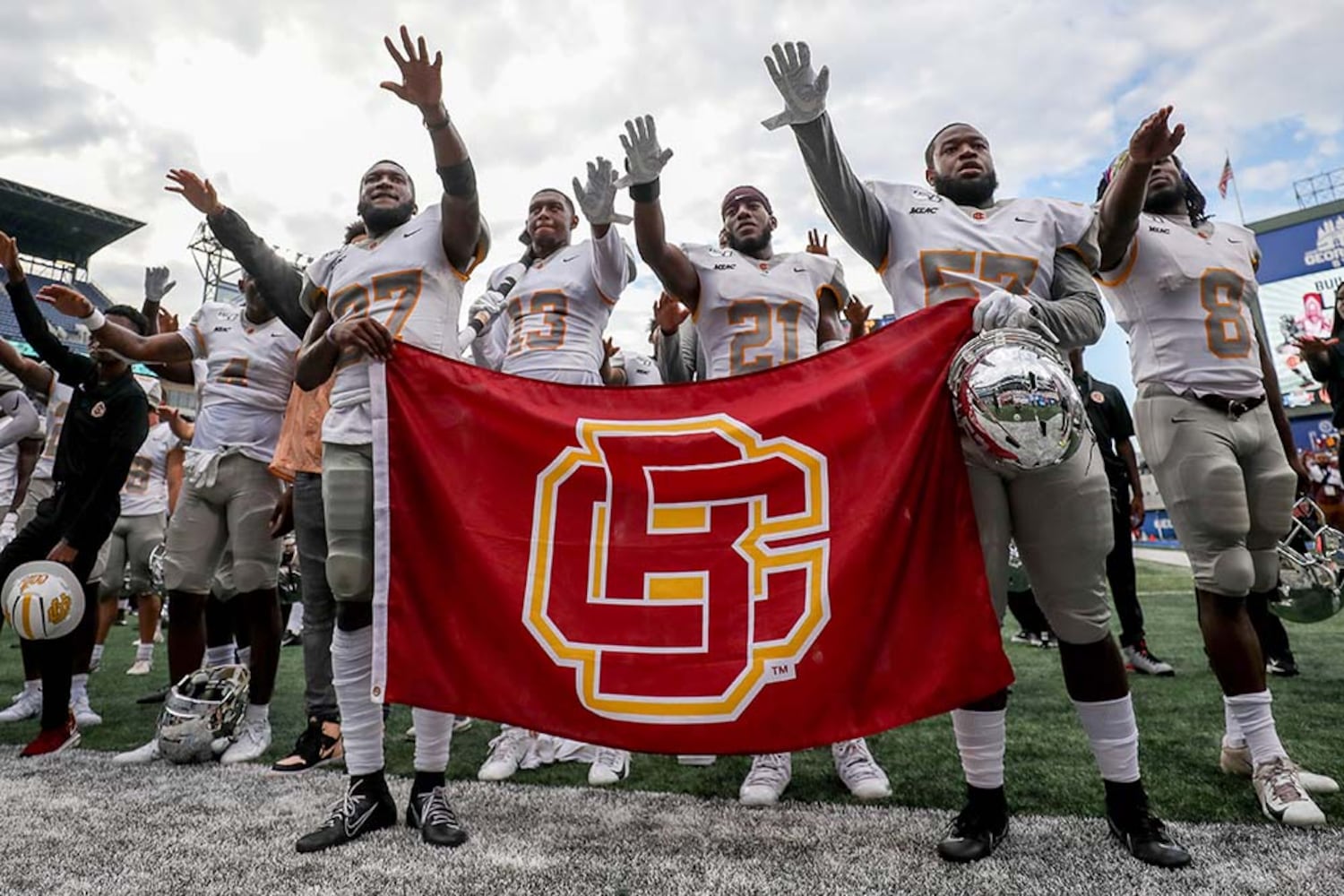 Joining the end zone pile-on was the Tiger’s mascot, who streaked in from the sidelines and in celebration tried to remove a Bethune-Cookman defender off Newman.