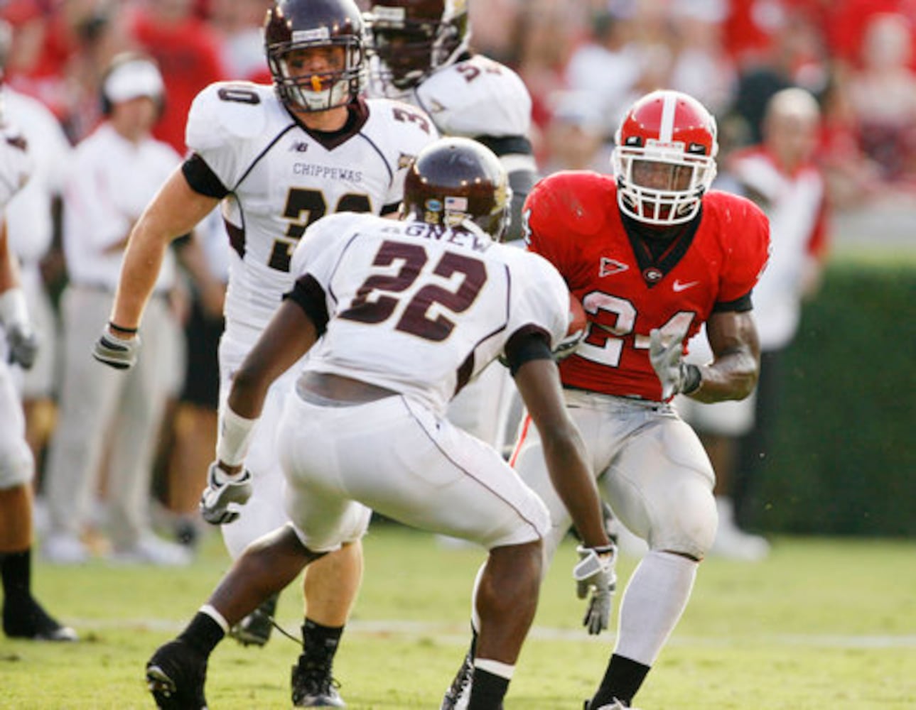 See a sequence of photos showing UGA running back Knowshon Moreno's acrobatic display as he leaps over a Central Michigan defender in the University of Georgia's win in Athens on Saturday.