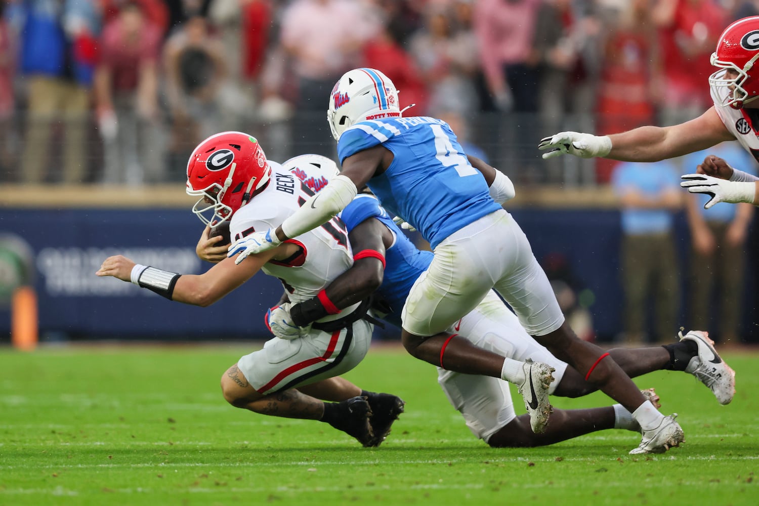 After Georgia jumped to a quick 7-0 lead, the Rebels went on a 22-3 run. The Bulldogs were on the move late in the third quarter had a first down at the Ole Miss 29. But on second down, freshman running back Nate Frazier fumbled on a short reception out of the backfield, and Walter Nolen recovered the ball to end the threat at the 3:26 mark of the third quarter.