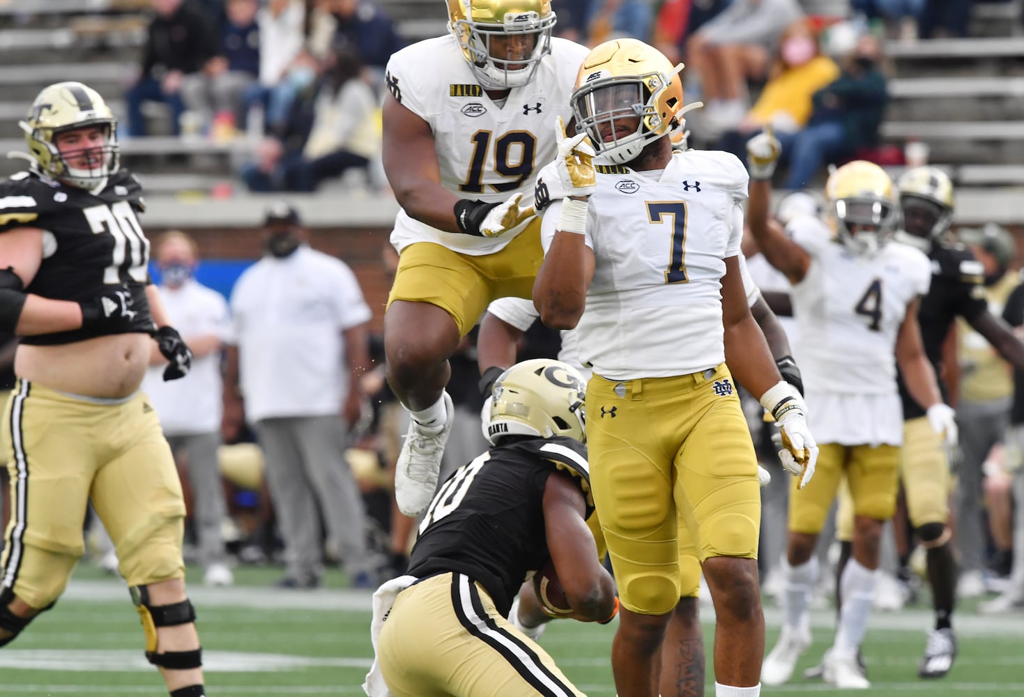 But the Irish were unfazed, answering with a 75-yard touchdown drive to move ahead 14-7, with Book digging out of a second-and-15 by scrambling for 10 yards. They added a field goal with 1:49 left in the half, capping a drive that began at the Tech 49-yard line when the Jackets went for it on fourth-and-2 from the Notre Dame 45, but running back Jahmyr Gibbs was tackled in the backfield on a pitch to the short side of the field.
