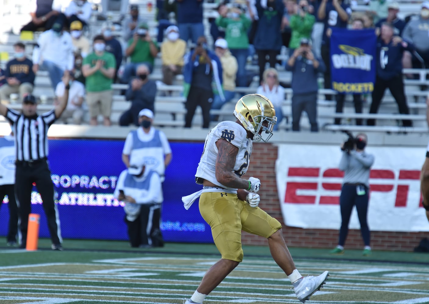 However, safety Juanyeh Thomas stripped running back Kyren Williams and cornerback Zamari Walton scooped up the fumble at the 7-yard line and raced 93 yards down the east sideline for a touchdown, the longest fumble return in school history. Jude Kelley’s point-after try tied the score at 7-7, even though Notre Dame at the time had gained 131 yards to Tech’s six. Notre Dame had completed the previous 31 possessions without a turnover.