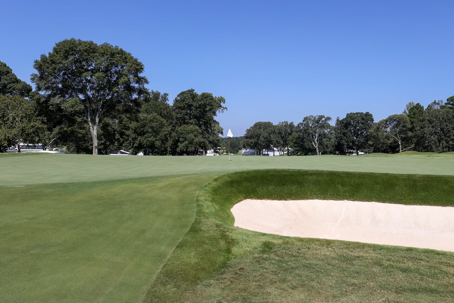 No. 5 — The Tour Championship tee of the par 4 was moved to the left to establish a dogleg left that flows along the ground and mimics the original bend of the hole. Some downtown buildings can be seen from the tee box.
