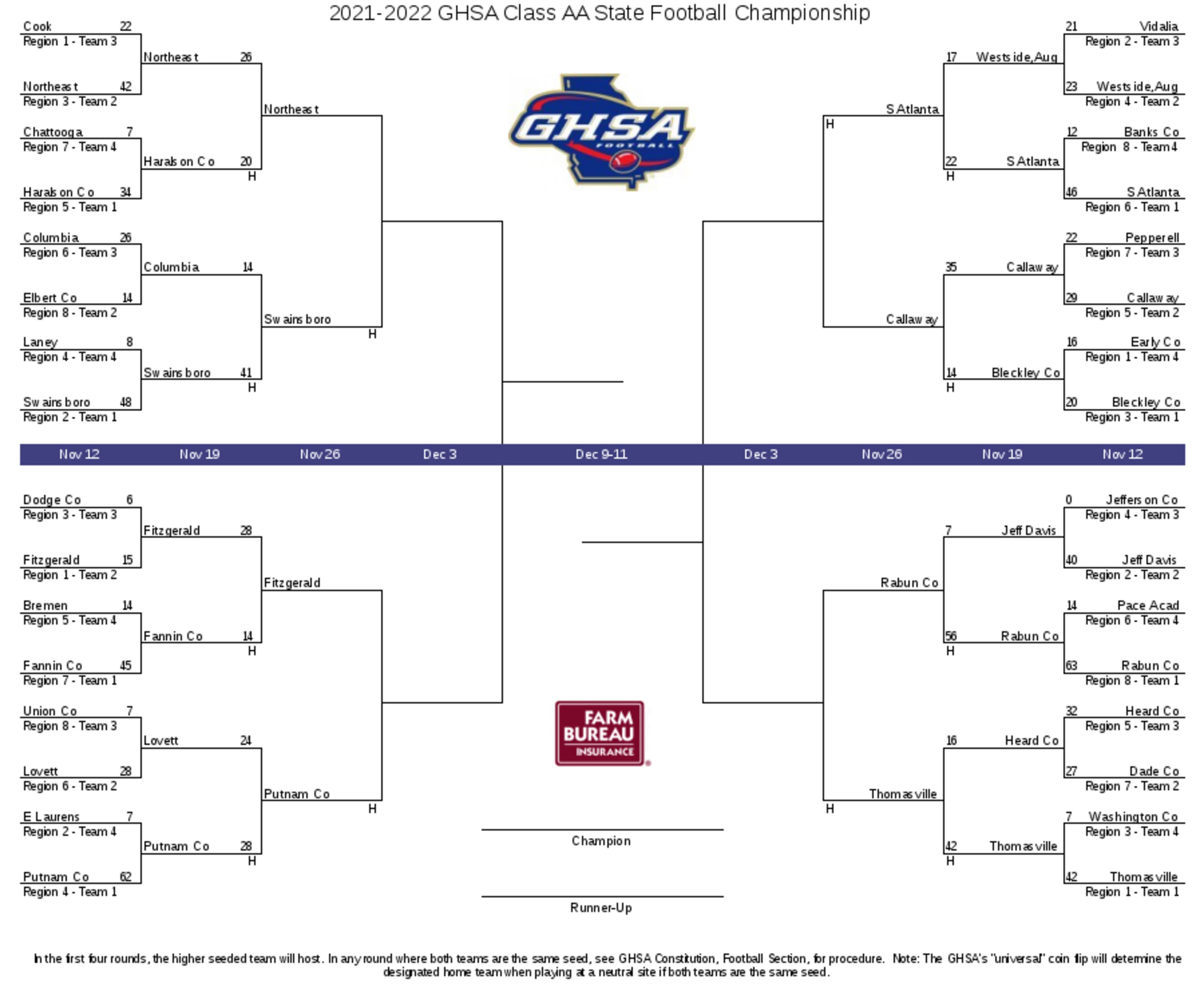 Rabun County will now travel to Thomasville as dictated by the GHSA’s universal coin toss, which decides home-field advantage in the case where like seeds meet. Both are No. 1 seeds.