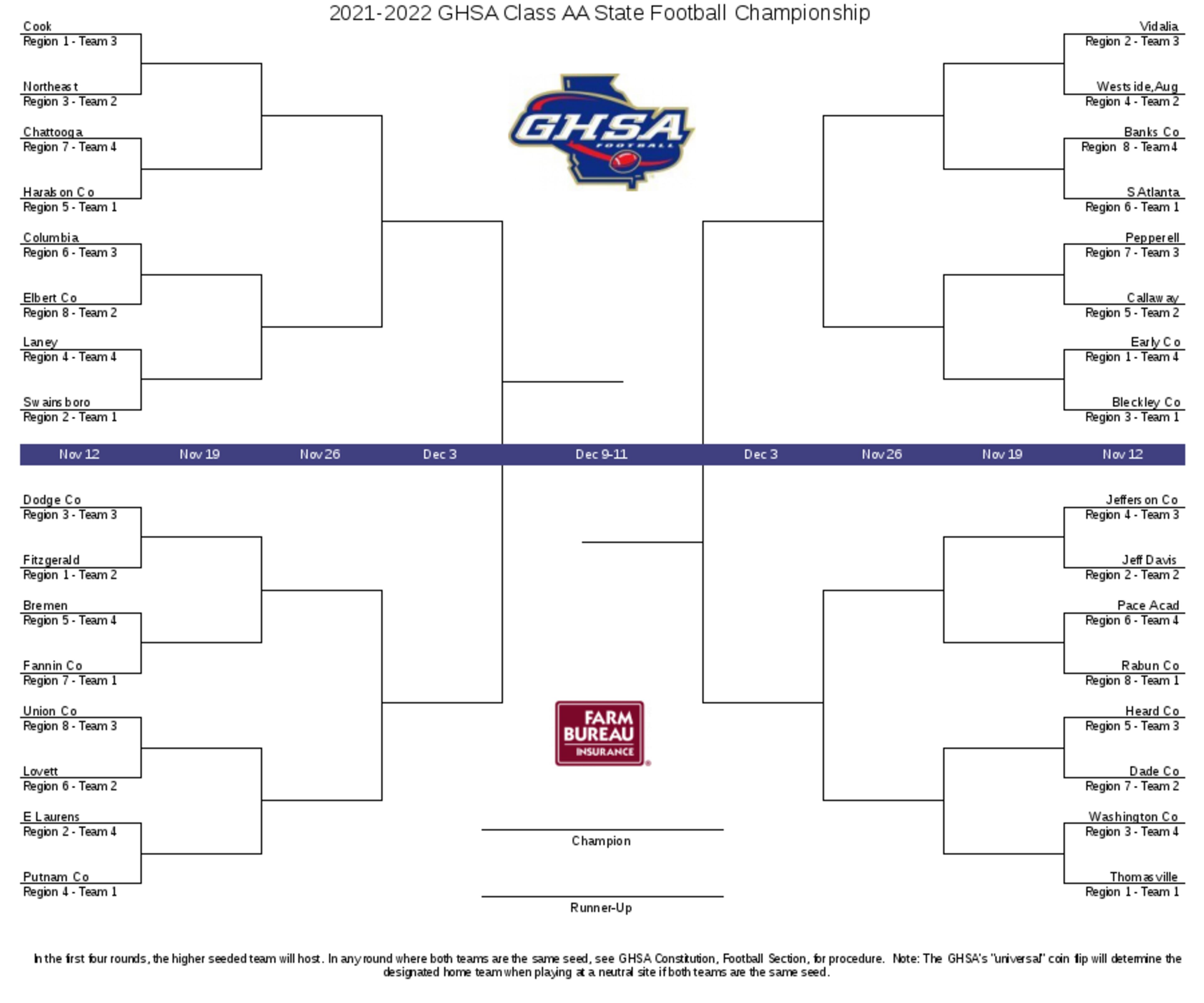 In the lower-right quadrant, the Jeff Davis Yellow Jackets (9-1) are 15-point favorites over the Jefferson County Warriors. The Jackets are looking to advance in consecutive seasons for the first time since 1989-90. The Warriors have reached the playoffs every year since 2002 and have advanced every year since 2013.