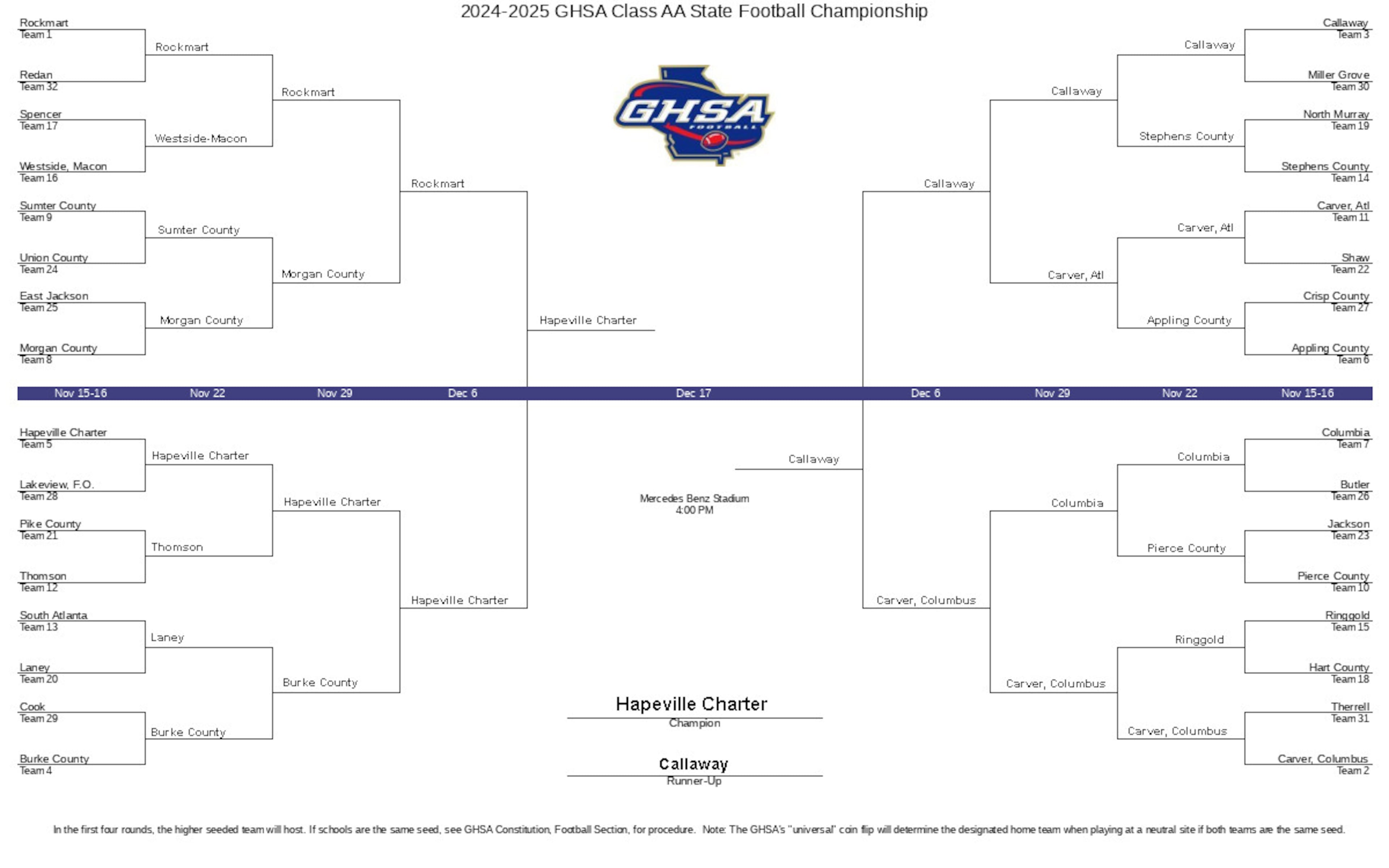 According to the future, the Hapeville Charter Hornets win their second title for a program that debuted in 2011, their other title coming when they won Class 2A in 2017. The Hornets started 0-2 and 1-3, losing to Lee County, Cartersville and Westlake before closing the season on a 6-0 run, all against 5-2A opponents, including a 15-12 win over Carver-Atlanta last week for the region championship.