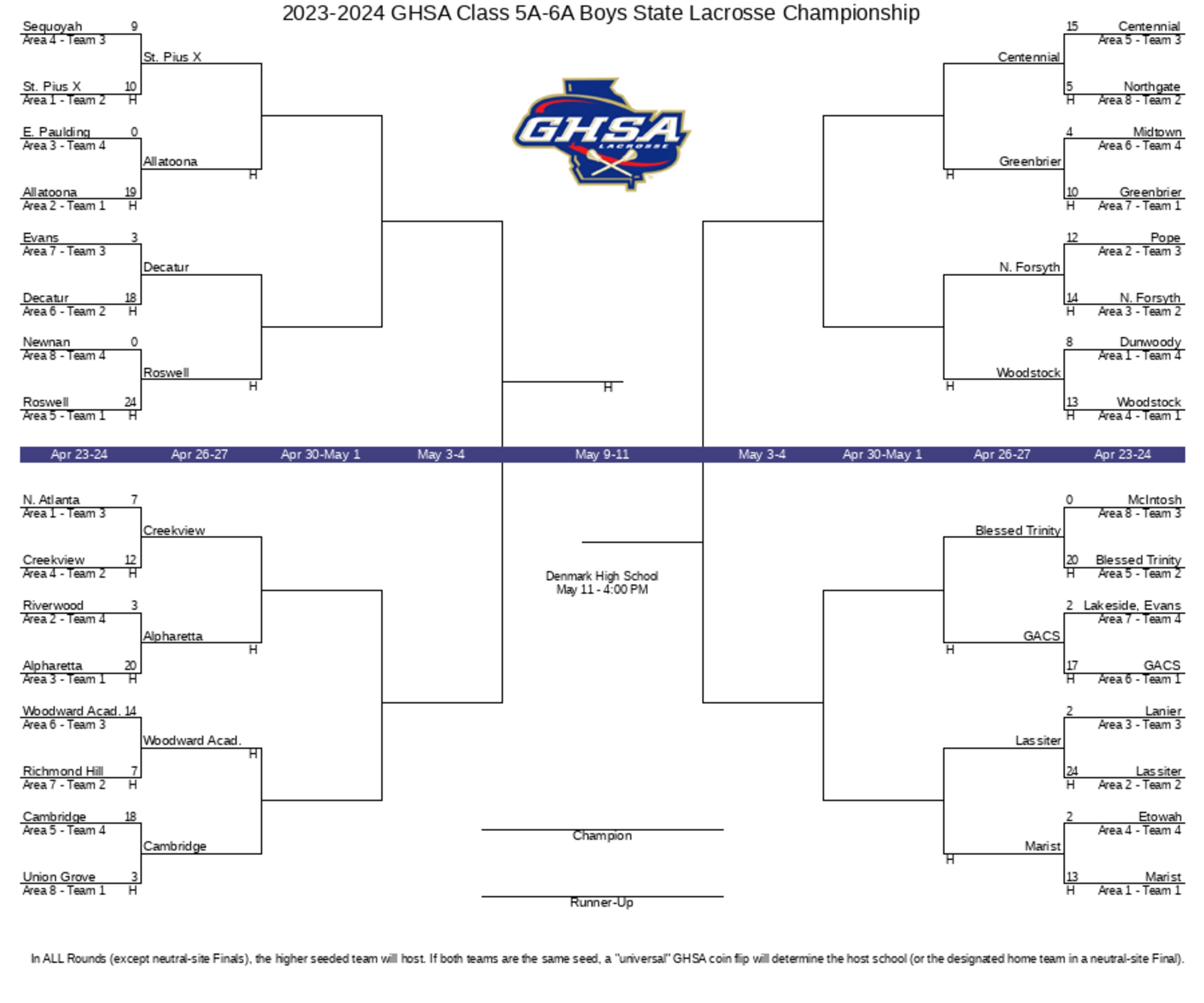 No. 1 Roswell opened its title defense with a 24-0 win over unranked Newnan. No. 2 North Forsyth esaped with a 14-12 win over unranked Pope. No. 3 Allatoona, No. 4 Lassiter, No. 5 Alpharetta, No. 6 Blessed Trinity and No. 8 GAC won big, while No. 10 Woodstock and No. 9 Greenbrier won by single digits. No. 7 Sequoyah lost 10-9 to unranked St. Pius X as a No. 3 seed.