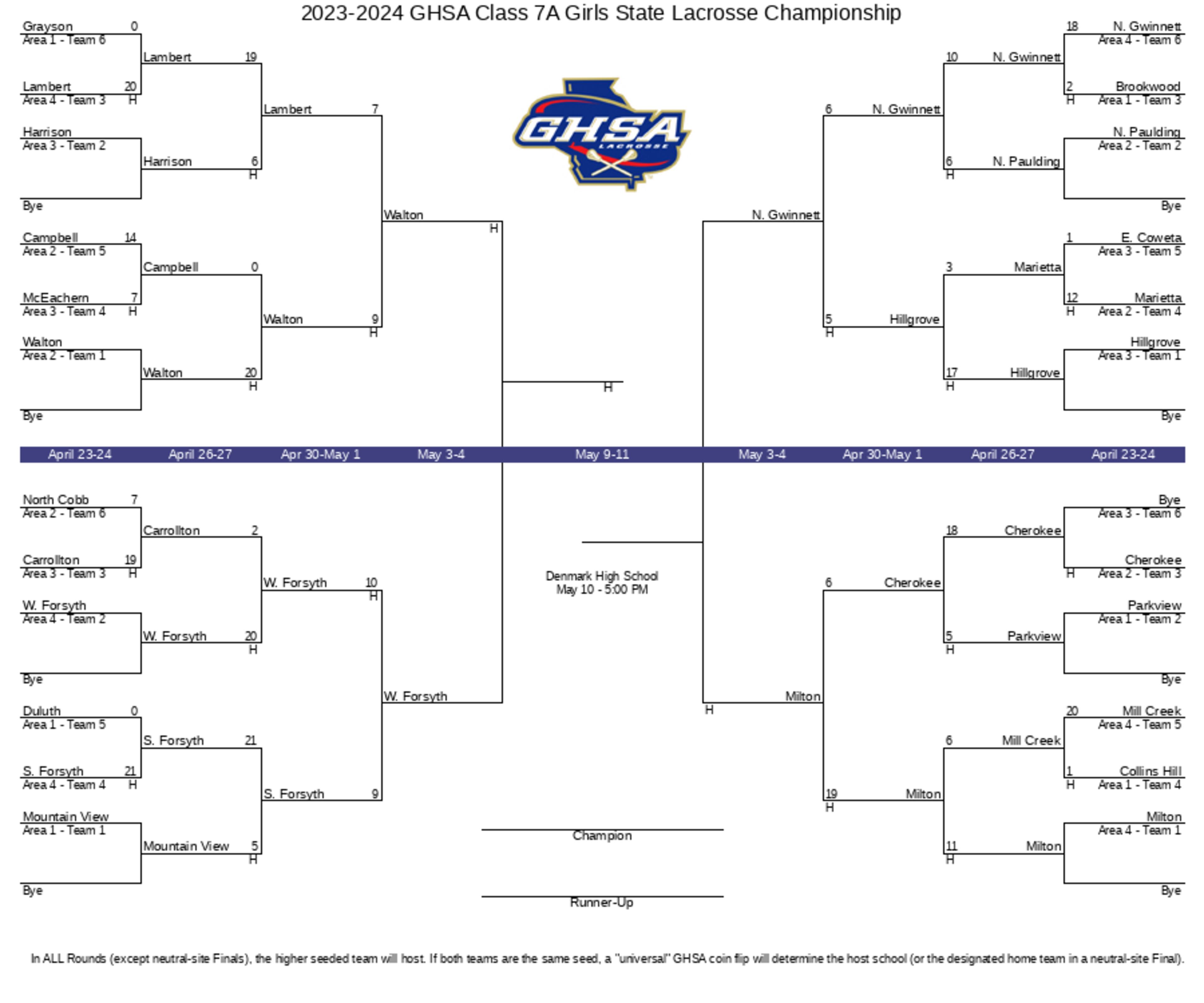 Three of the teams ranked in the top four advanced, the lone exception being unranked North Gwinnett, which beat No. 5 Hillgrove 6-5. It will now play top-ranked Milton, the heavy favorite for a seventh straight title, which beat No. 2 Cherokee 19-6. No. 3 West Forsyth beat No. 9 South Forsyth 10-9 and will play No. 4 Walton, which crushed No. 7 Campbell 20-0.