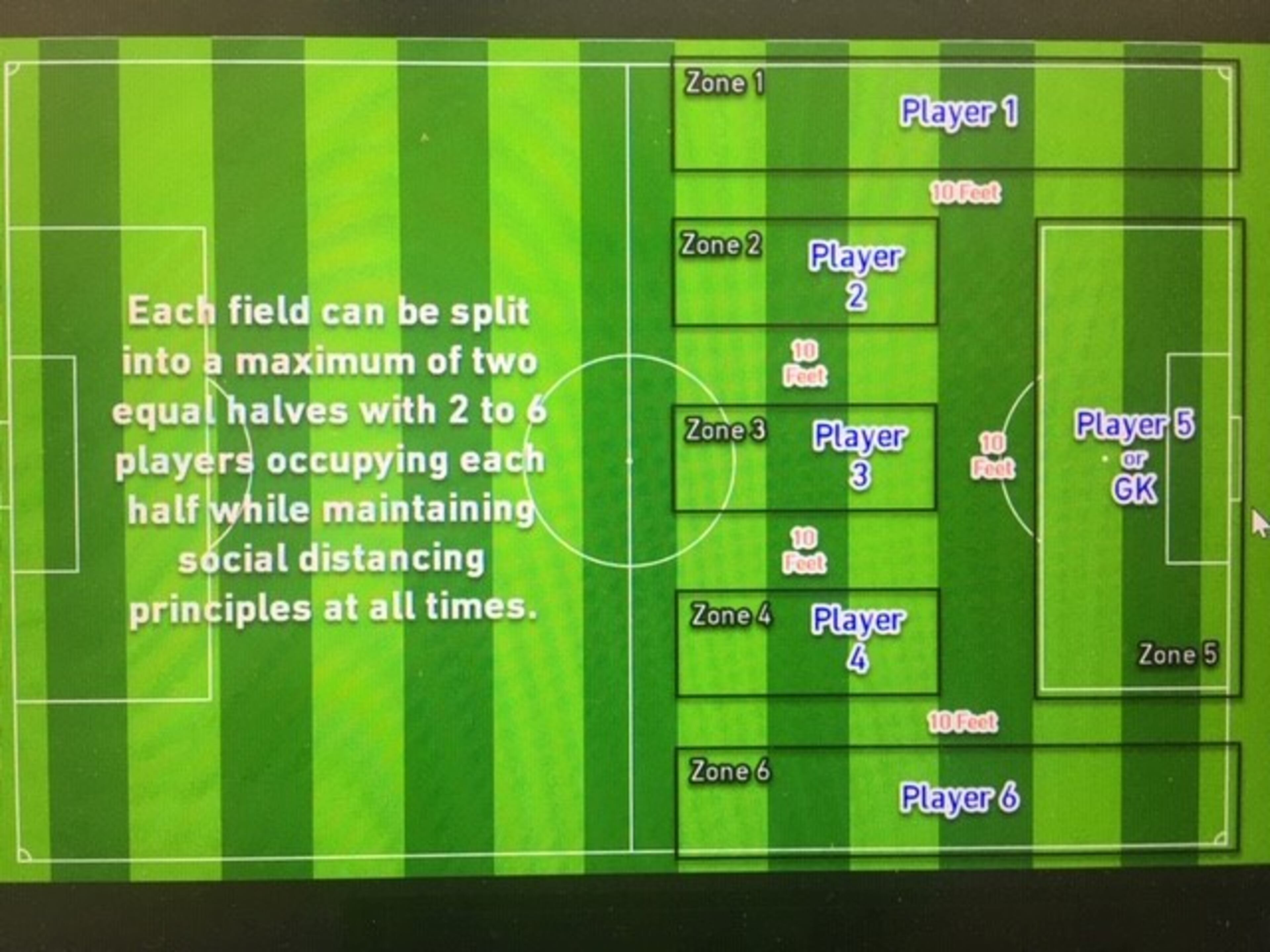In the individual sessions, the fields are quartered with each player training in a quadrant. In the group sessions, the fields may be halved, with six zones spaced at least 10 feet apart in each half. Each zone can have a maximum of one player. There can be a maximum of six players on one half of a field.
