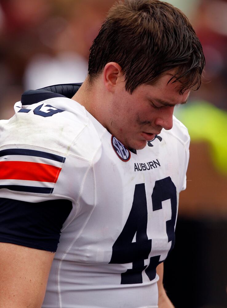 Philip Lutzenkirchen #43 of the Auburn Tigers celebrate after pulling in this go-ahead touchdown reception against the South Carolina Gamecocks at Jordan-Hare Stadium on September 25, 2010 in Auburn, Alabama. (Photo by Kevin C. Cox/Getty Images) Lutzenkirchen died in multiple-fatality crash in the early morning hours of Sunday, June 29, 2014. He was ejected from the vehicle. He was 23 years old at the time of his death.