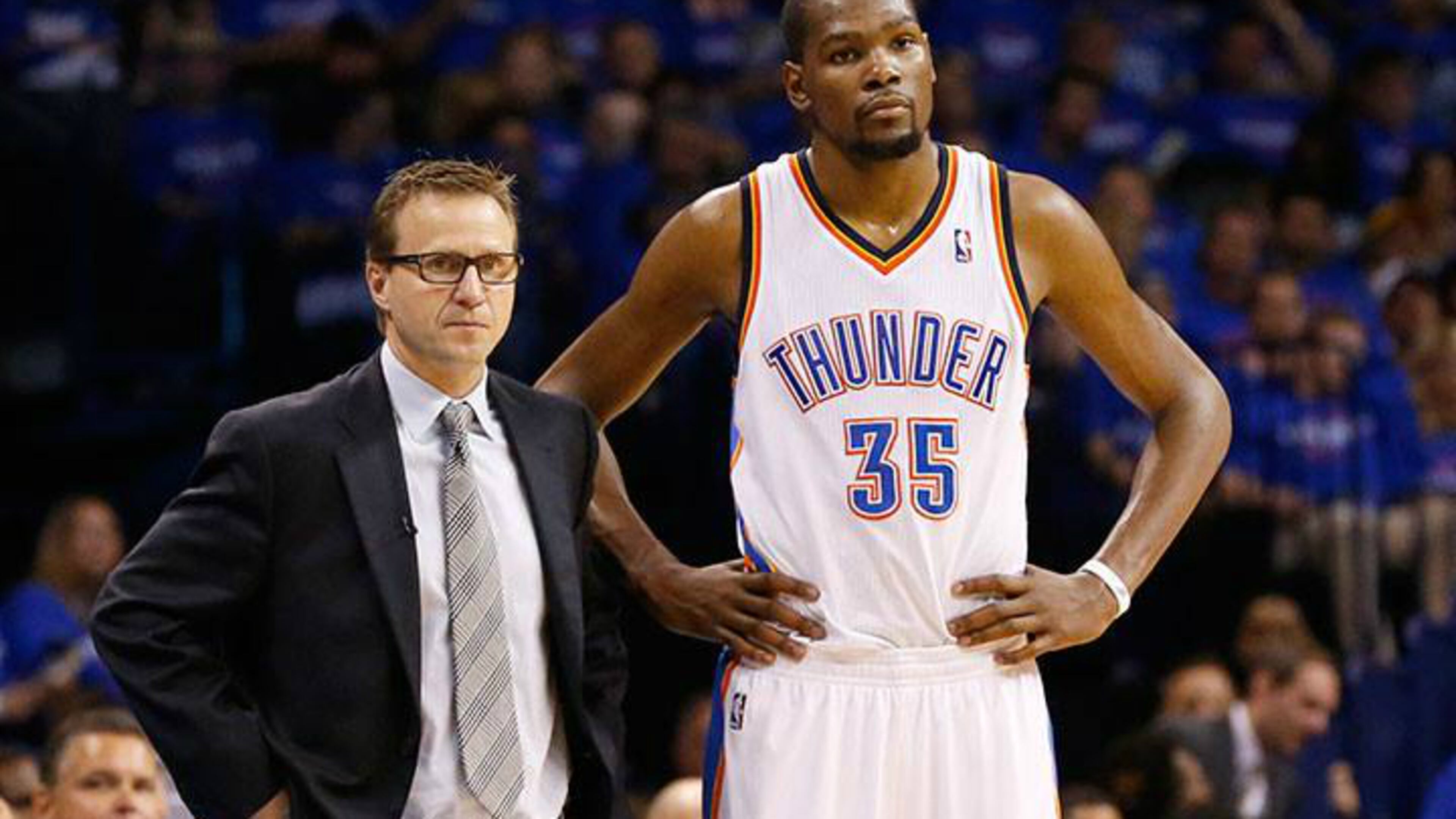 It shows Thunder coach Scott Brooks standing next to Kevin Durant with the score listed as "Los Angeles Clippers 122, Former Sonics 105." OKC won game two of the series 112-101 Wednesday night.