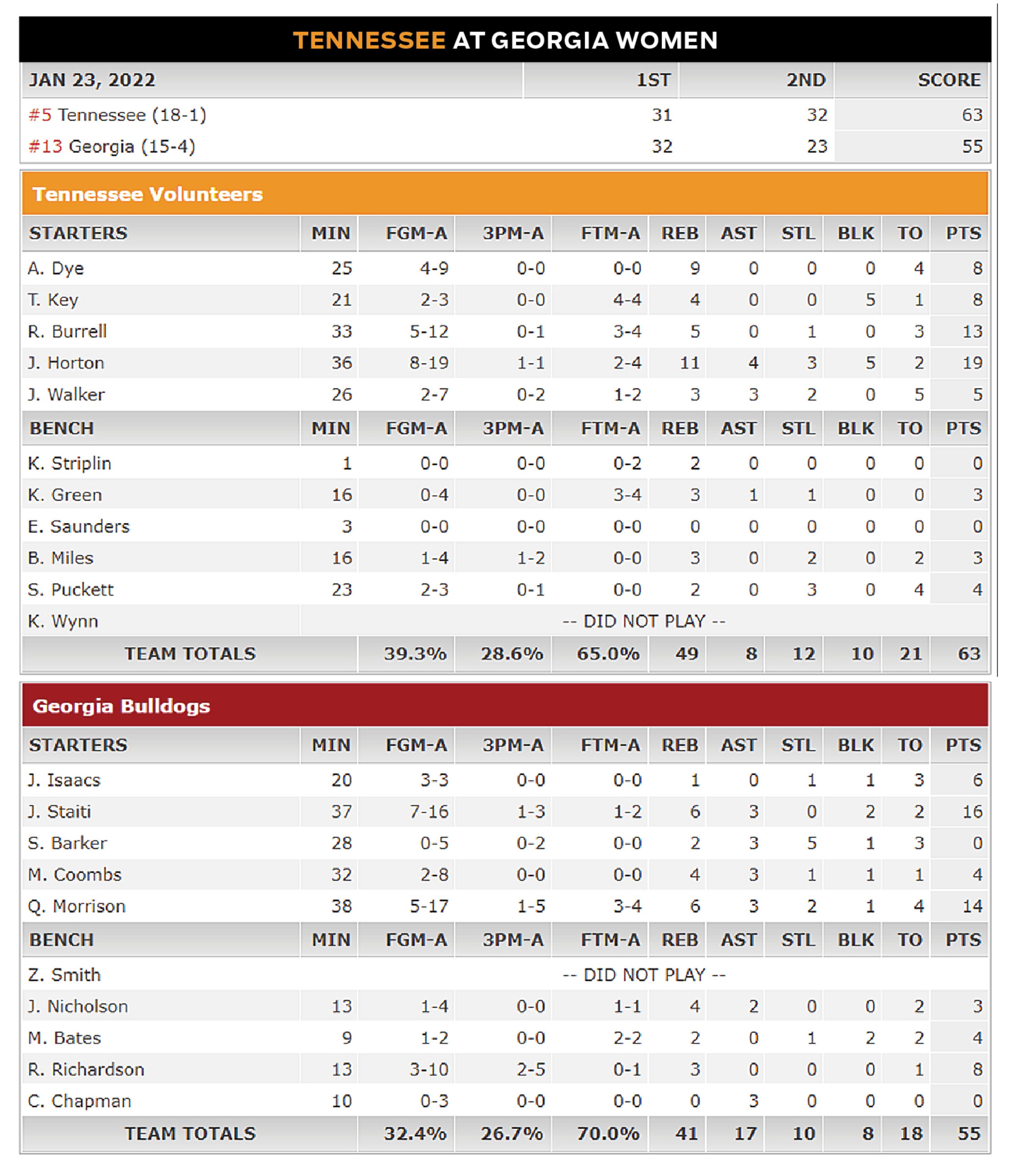 Jordan Horston scored 19 points with 11 rebounds and No. 5 Tennessee overcame a sluggish first half to beat No. 13 Georgia 63-55 on Sunday and remain undefeated in Southeastern Conference games.