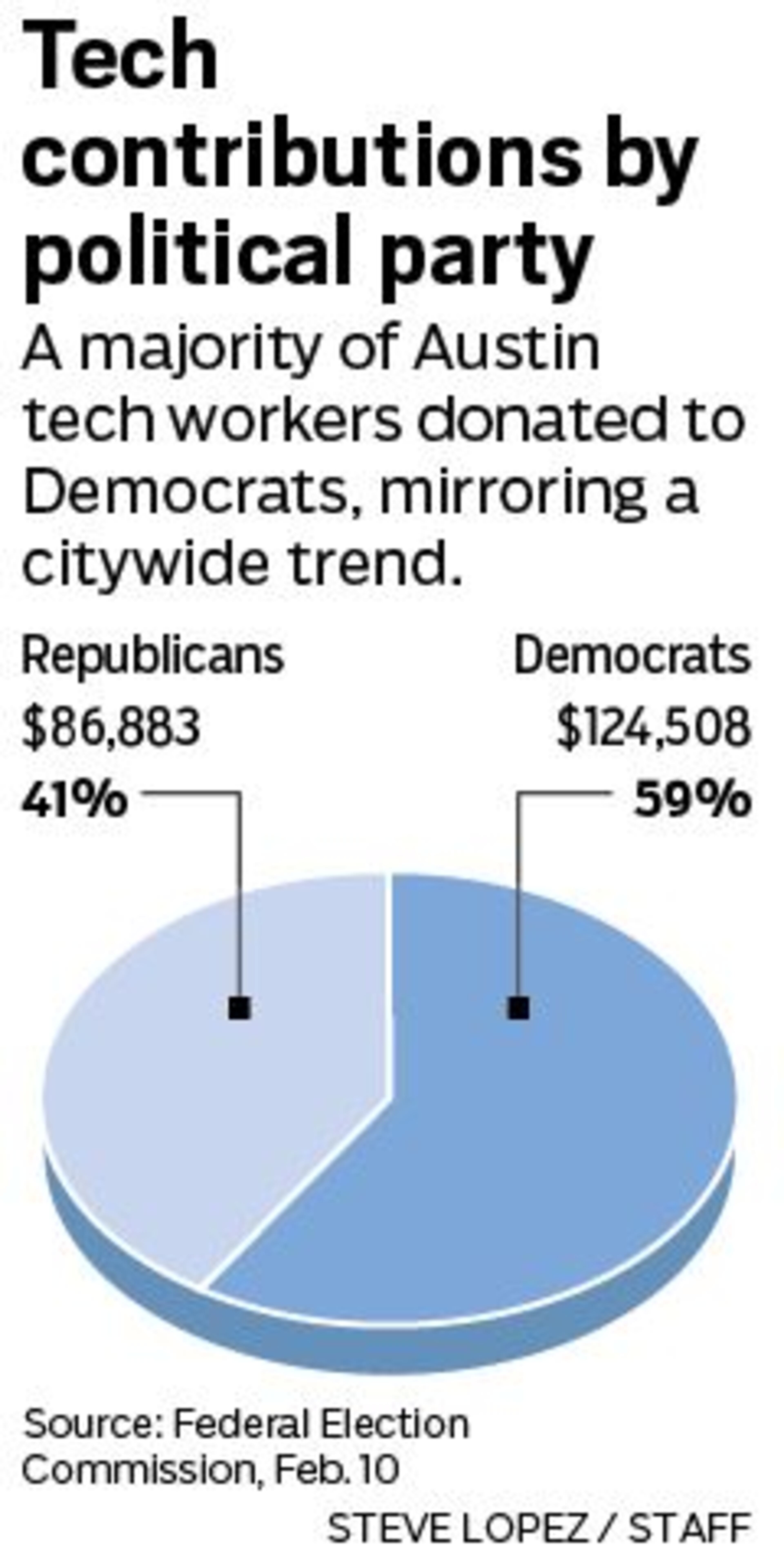 A recent Bloomberg analysis of donations from Silicon Valley tech firms seemed to back this up: Democrats raised $3.82 million versus $2.28 million for Republicans. In Austin, Democrats also have the fundraising edge among tech workers, raising $124,508 versus Republicans’ $86,883.