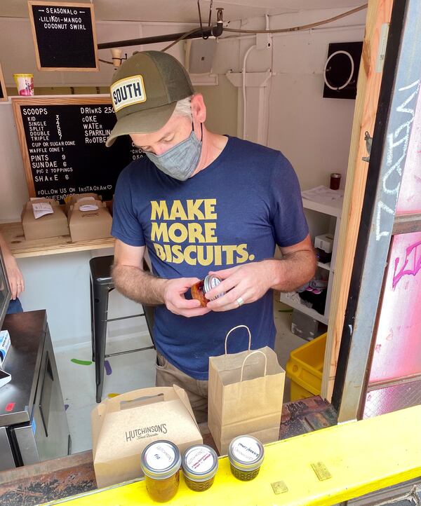 On Sunday mornings, a small but devoted flock of biscuit purists can be spied calling at a walk-up window on Elizabeth Street in Inman Park. They’ve come to fetch cardboard gable boxes filled with Hutchinson’s Finest Biscuits. Square and fluffy, these golden brown wonders are the handiwork of Todd Tharp, who rises early to bake classic Southern buttermilk biscuits. To me, they are best when slathered with his knockout fig preserves and extraordinary peach and blueberry jams, which taste like the very essence of summer.