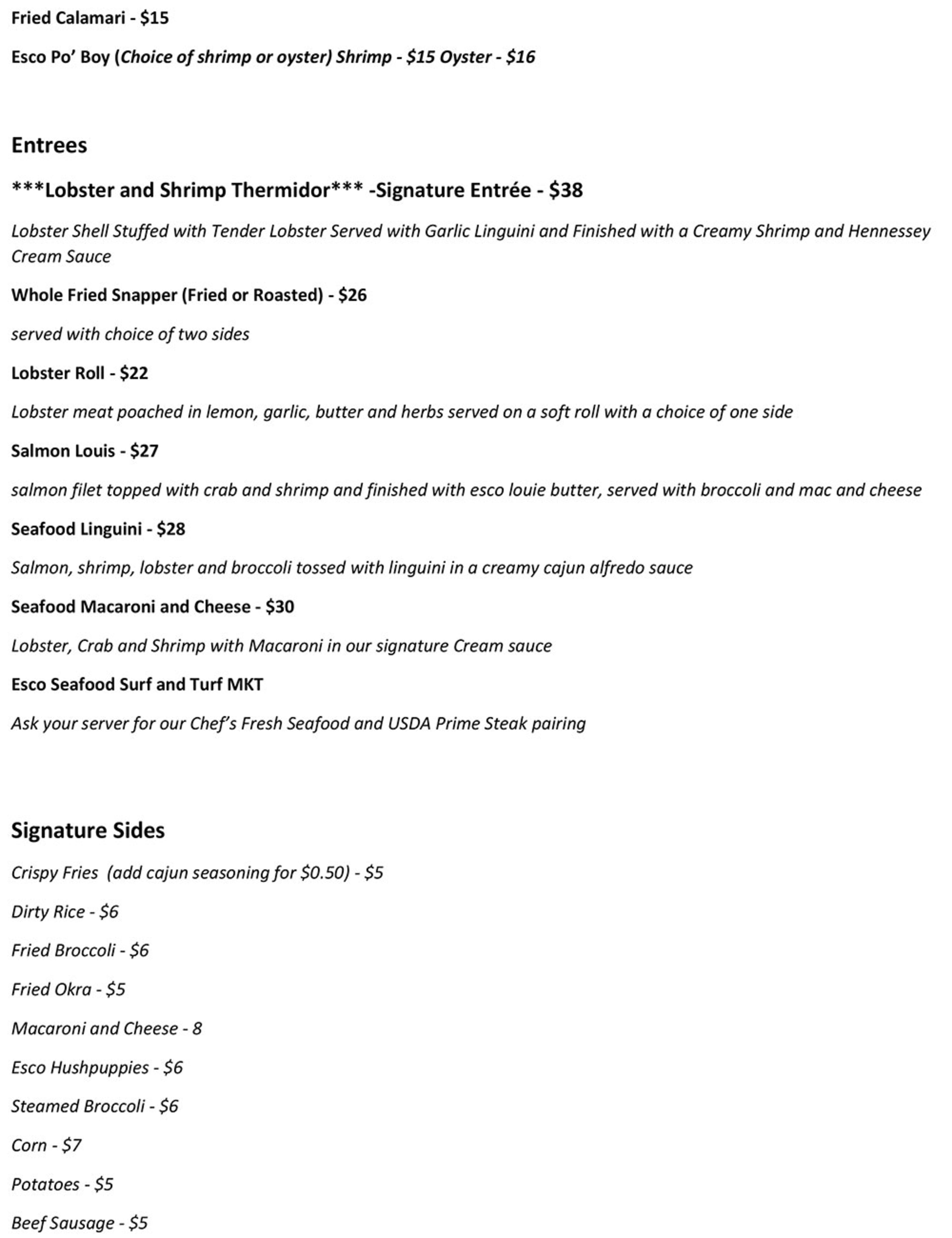 Options on the extensive menu include seafood buckets and platters, chargrilled oysters and a seafood Louis salad made with mixed lettuces, crab, lobster, shrimp, tomatoes, boiled egg, cucumber and sweet and spicy Esco Louis Dressing.