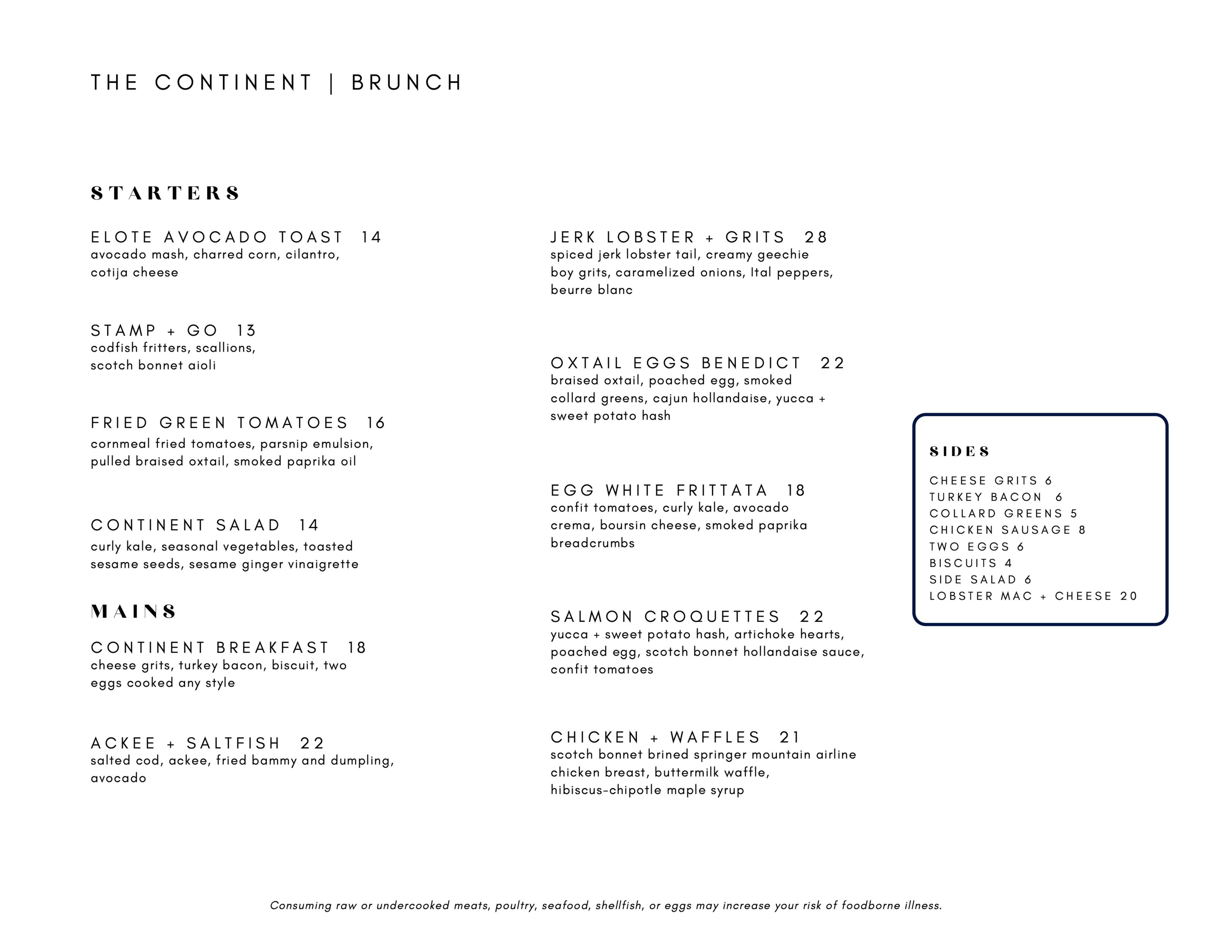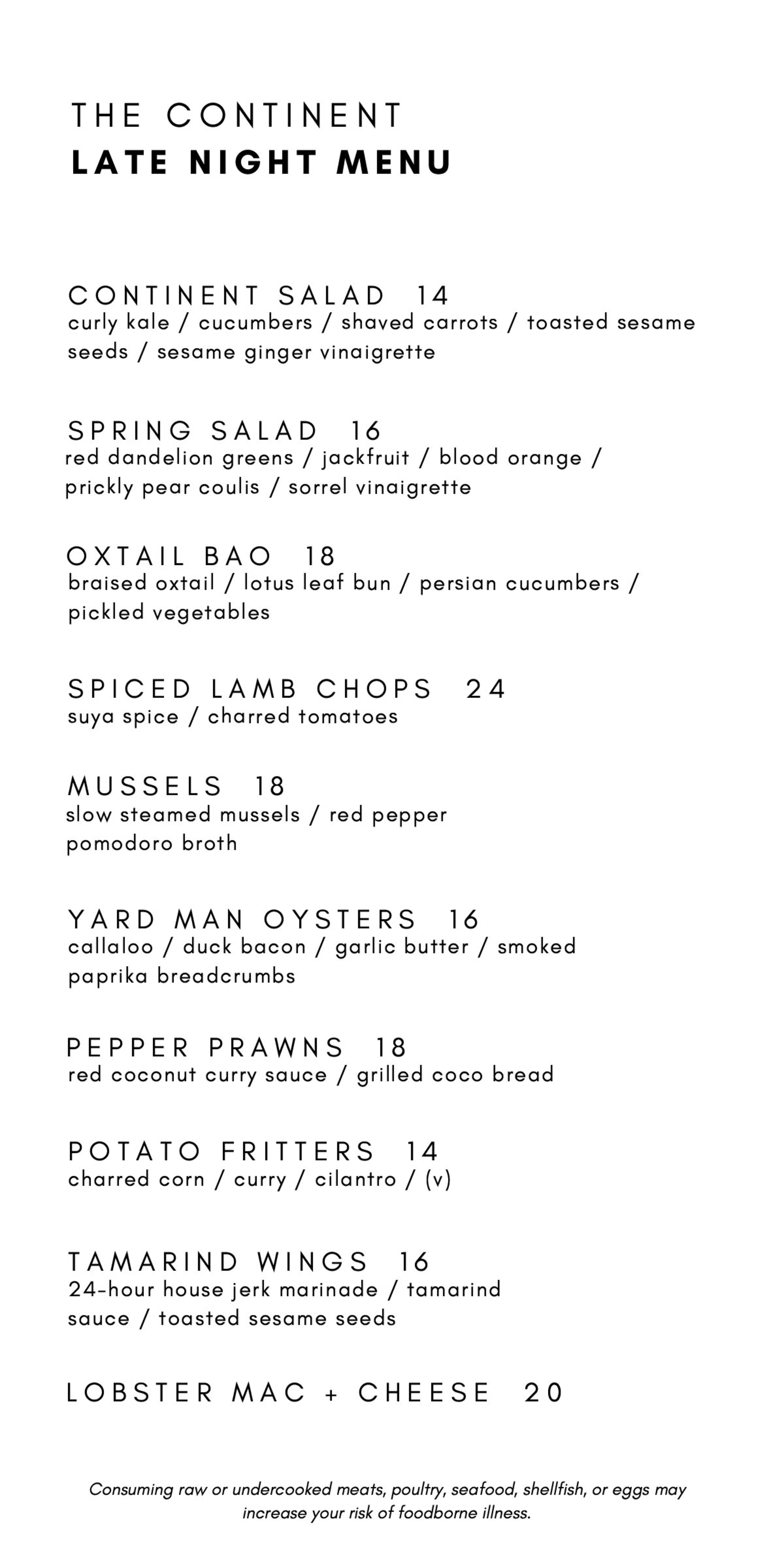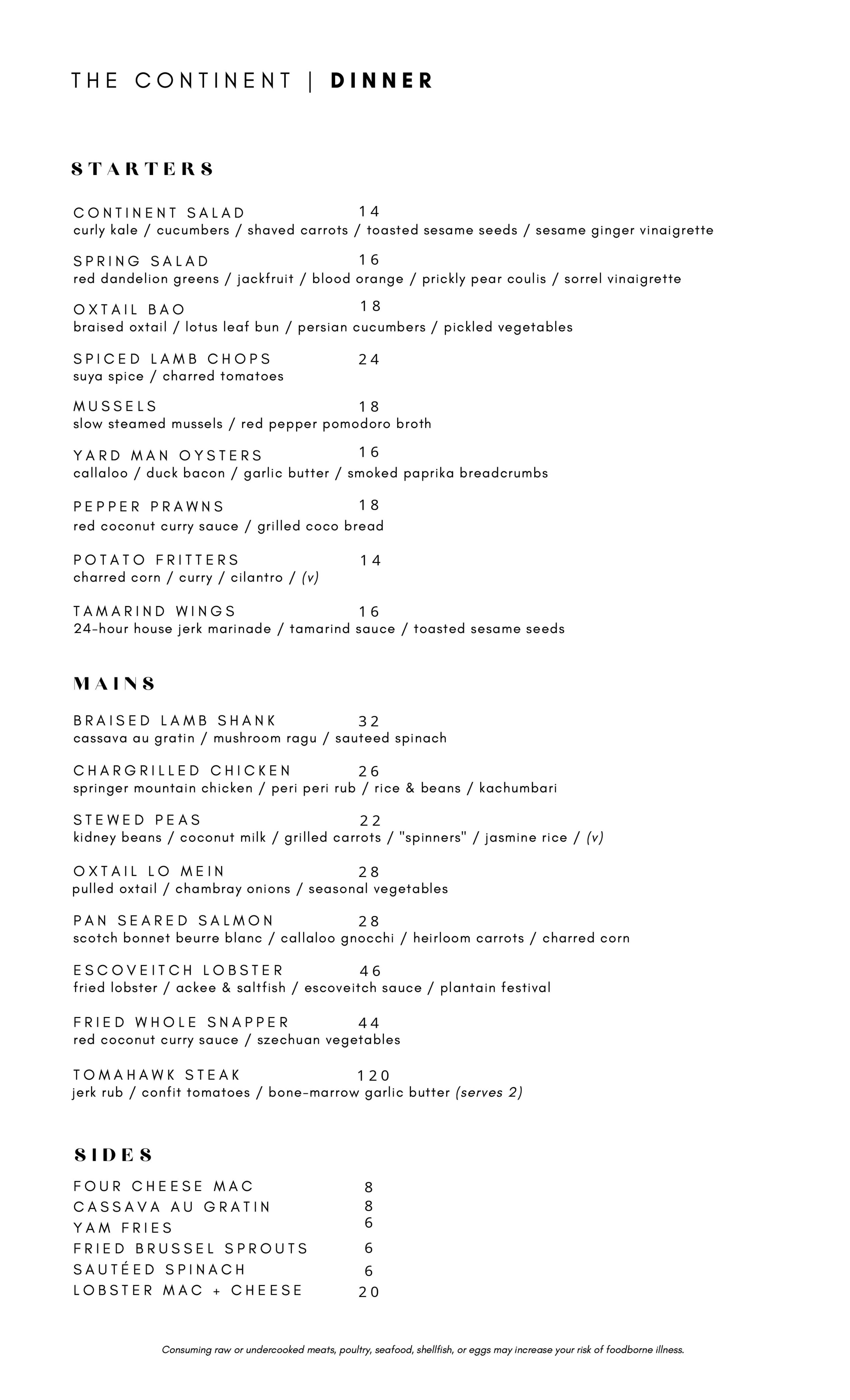 Open for dinner, late-night food and drinks, and Sunday brunch, Continent will offer dishes including the Jamaican-inspired oxtail lo mein with braised oxtail, baby bok choy and chambray onions; lamb suya chops topped with red onions and charred tomatoes pay homage to Nigerian street food; and Yardman Oysters, offering a Jamaican twist on traditional oysters Rockefeller with callaloo, duck bacon, garlic butter and Parmesan cheese.