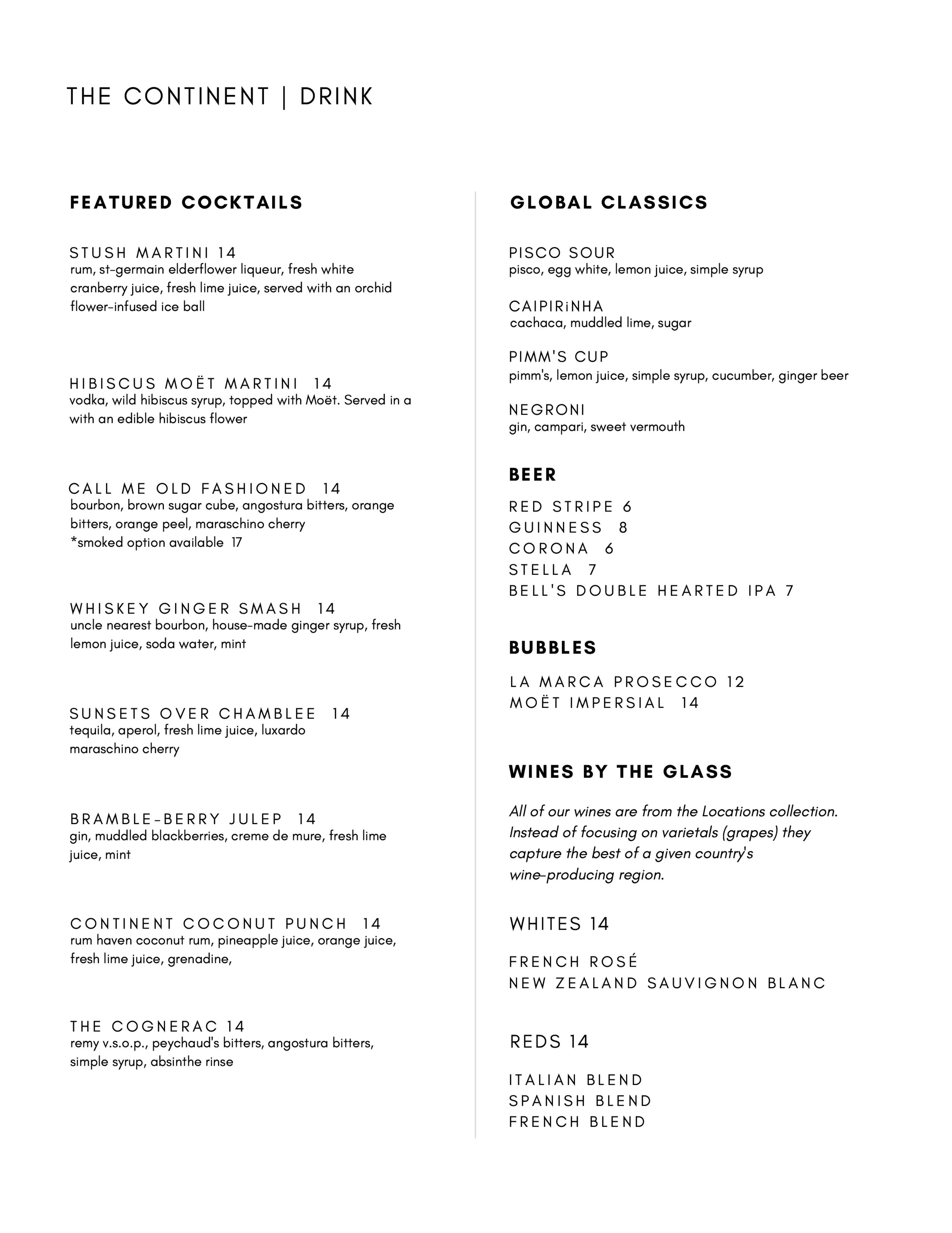 The adjoining Continent Cigar Lounge features a humidor stocked with brands like Cohiba and Rocky Patel as well as hand-rolled cigars including the signature Continent Cigar. The lounge will have a cigar membership program, including a private locker to store cigars and access to bi-monthly events. A separate menu will offer rare and aged spirits and small plates.