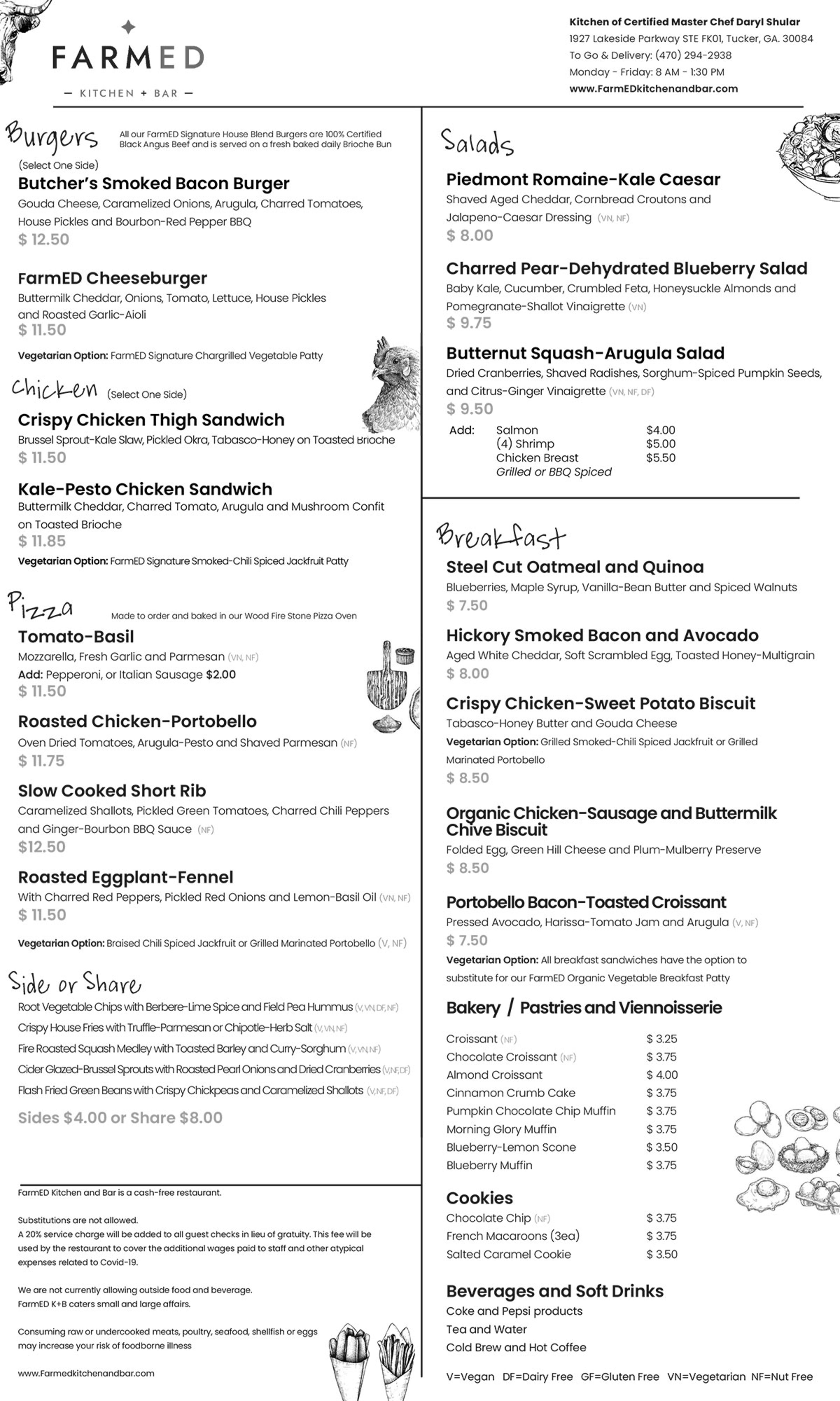 In addition to dine-in service, Farmed offers curbside pickup and delivery via third party services, including DoorDash.