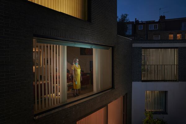 Burdeny’s scenes are often devoid of people. We, in fact, are the people in his scenes, with a perfect view arrayed for our greedy eyes. And Fullerton-Batten’s photos are defined by people who we can’t help but activate in our mind’s eye, into players in the complex dramas she has set up that we long to fill in beyond the margins. In an image from her series “Looking Out From Within” meant to capture the isolation of quarantining during COVID-19, Fullerton-Batten photographs an older woman “Kitty” in a chartreuse dress who has lowered the blue surgical mask from her mouth. The photographer’s vantage is from outside as Kitty peers out her apartment window, another human statue caught in her own lonely trance.