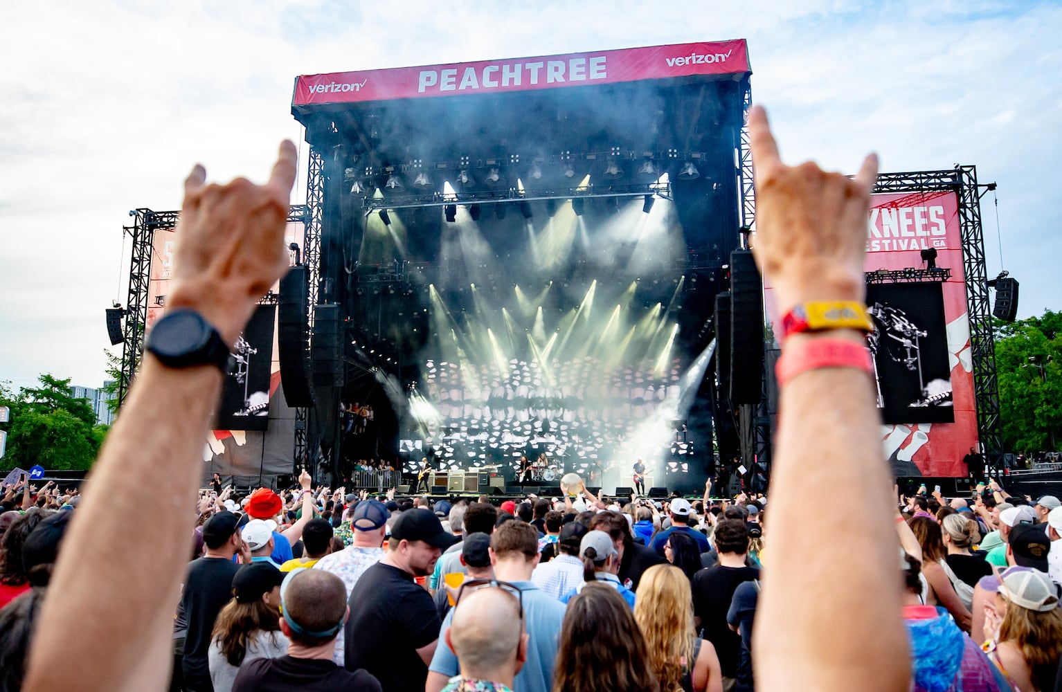 Singer Billy Idol stepped onto the Peachtree Stage in a leather jacket decorated with gold chains and pins as the weather began to calm down. The audience danced around — and in — a large puddle of mud left by the torrential downpour and fist pumped as the spiky-haired, growly-voiced MTV star took them down memory lane with “Dancing With Myself,” “Cradle of Love,” “White Wedding,” “Power Junkie,” and his cover of Tommy James and the Shondells “Mony Mony.”