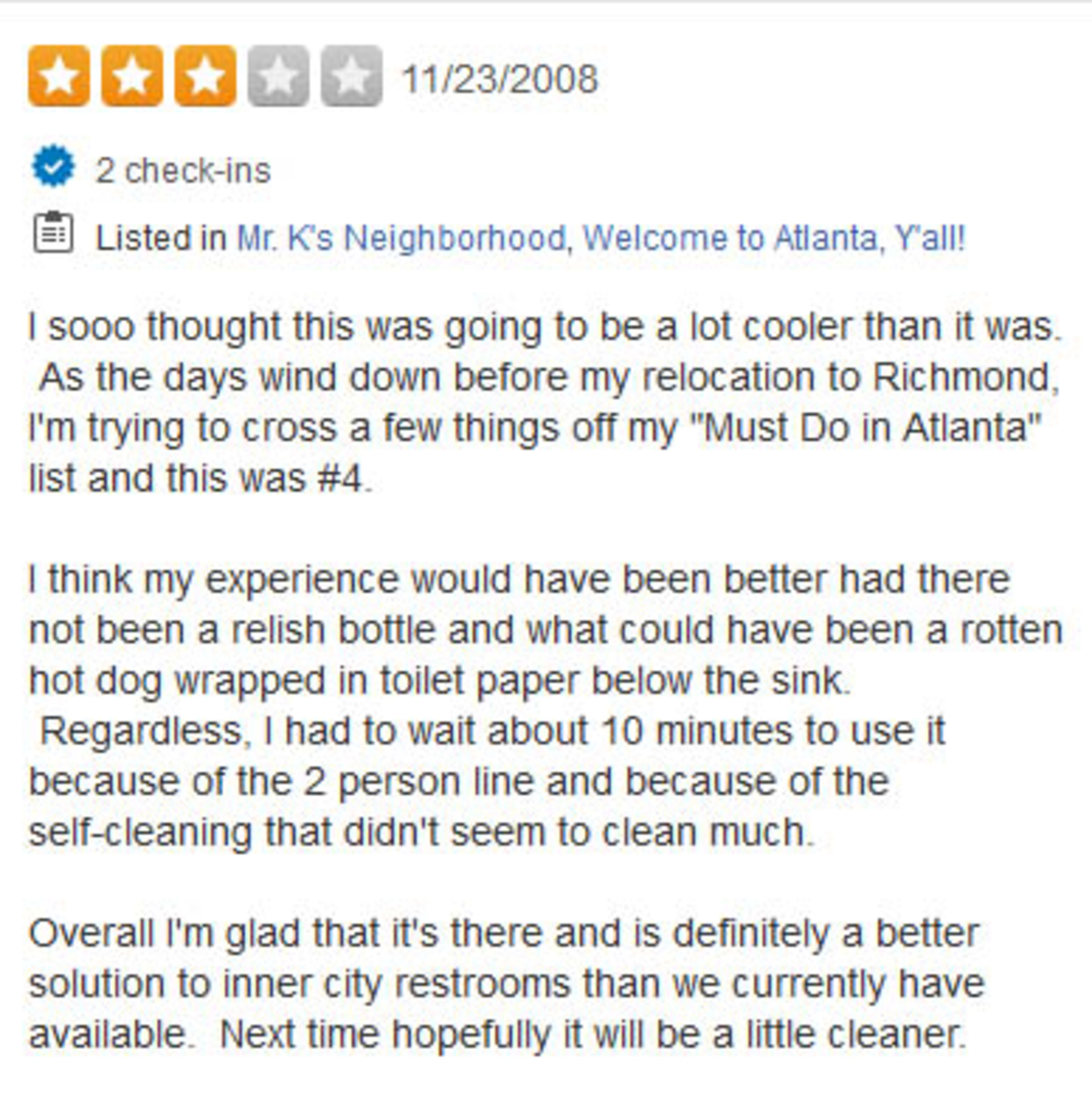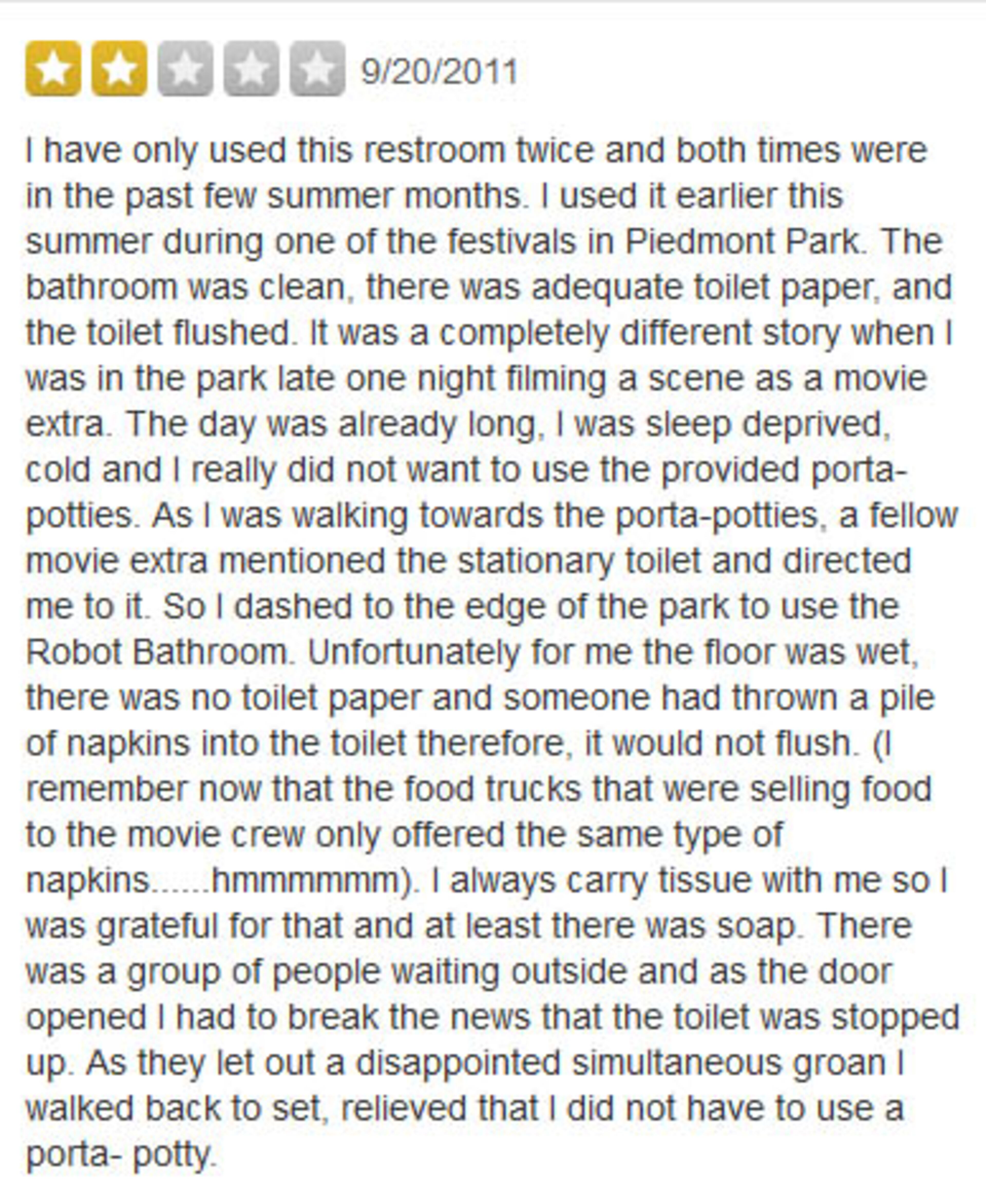 The self-cleaning bathroom at the park’s Charles Allen Drive entrance has nearly two dozen reviews all in itself. Here are a few of the negative ones.
