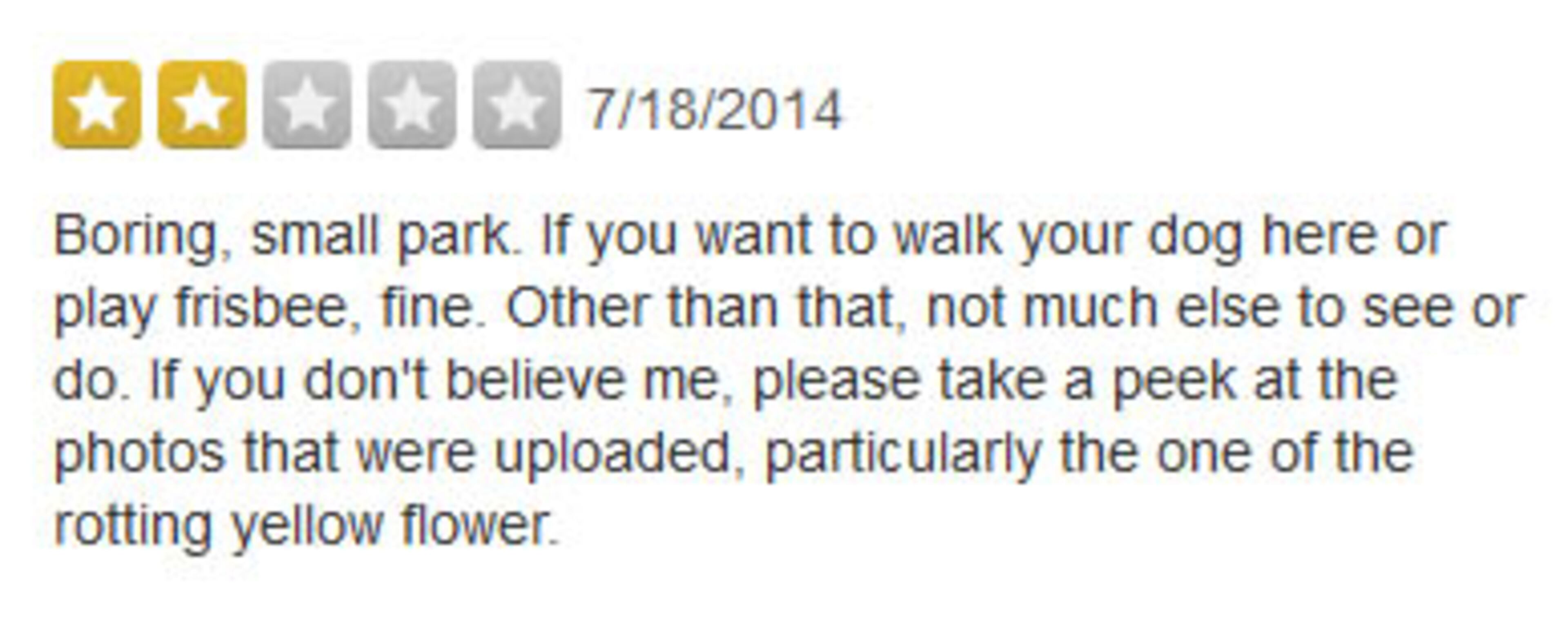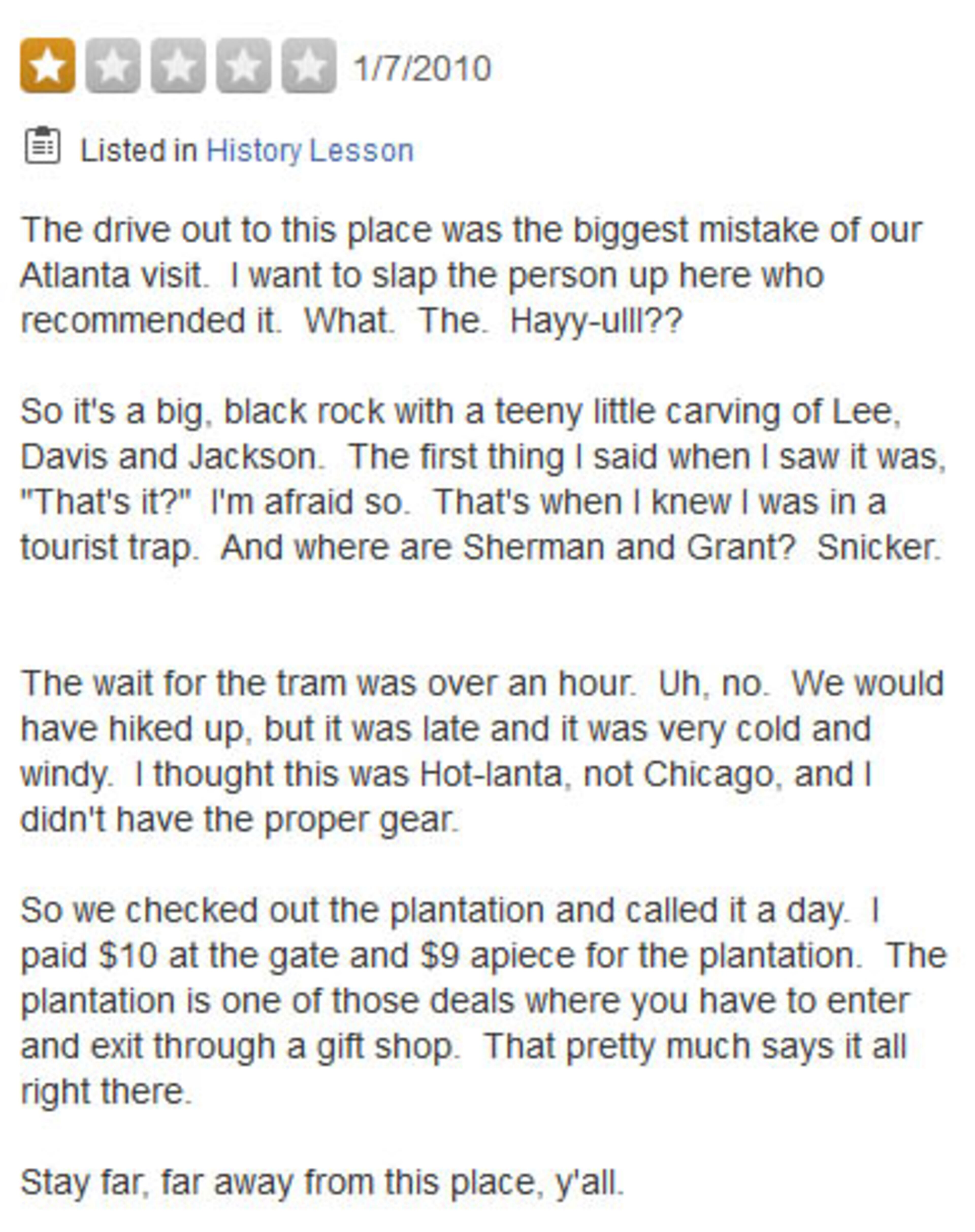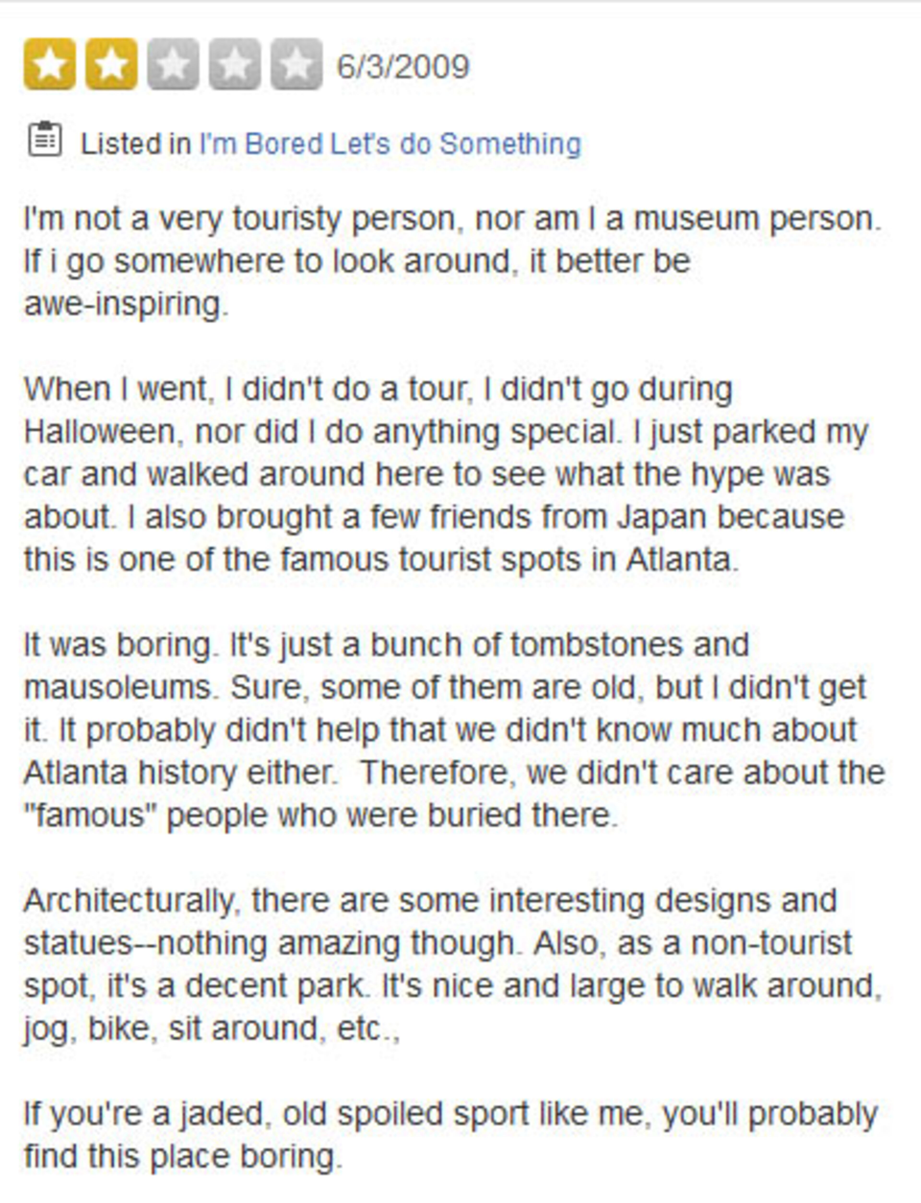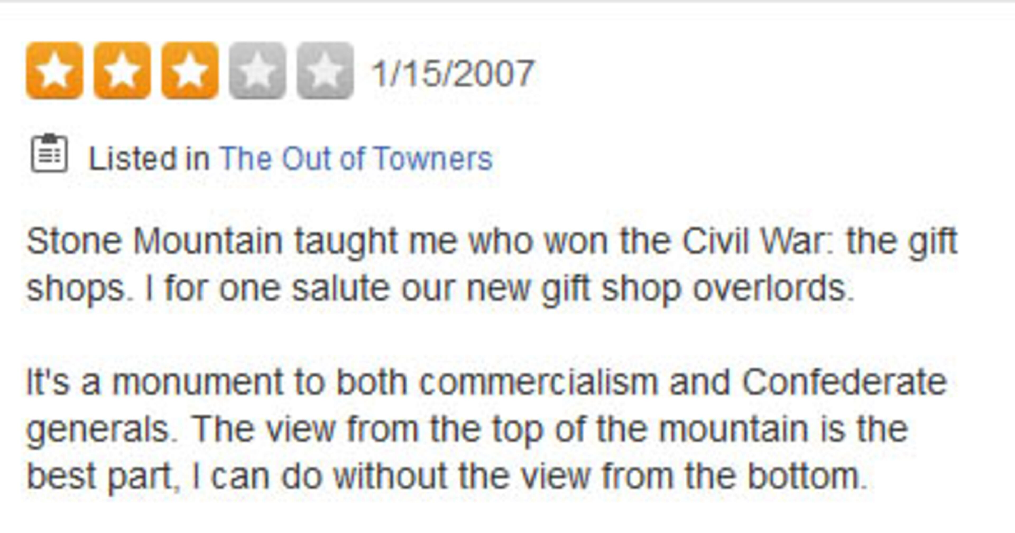 Sept 23, 2015Atlanta doesn’t lack for city pride, so it always stings when an otherwise reasonable person finds fault with one of our city’s jewels. The reviewers on Yelp can be a finicky lot, as Mother Jones discovered last month. Inspired by that magazine’s critical tour of our country’s national parks, we’ve assembled some rather tart takes on our own public spaces.