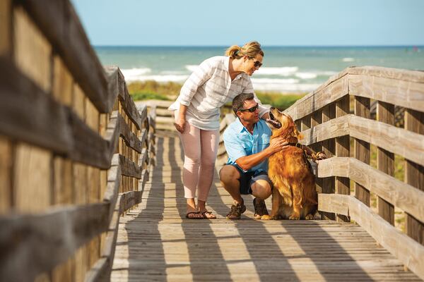 If a romantic getaway involves bringing along a beloved four-legged friend, check out New Smyrna Beach, a notable pet-friendly destination. Stay at the pet-welcoming AAA Four-Diamond property Black Dolphin Inn on the Indian River with a private dock and made-to-order breakfast served each morning. The 14-room inn with spa-style bathrooms is located in a quiet neighborhood on a palm tree-lined street and has ground-floor rooms with private entrances for taking pups out at all hours. They’ll even let you bring your cat (two-animal limit). A short drive away, pristine and dog-friendly Smyrna Dunes Park sits on a 184-acre peninsula where the ocean meets the Indian River at Ponce de Leon Inlet. It’s a scenic walk along dune crossovers to reach the dog-friendly beach at the inlet, making fall with its milder temps a good time to visit.