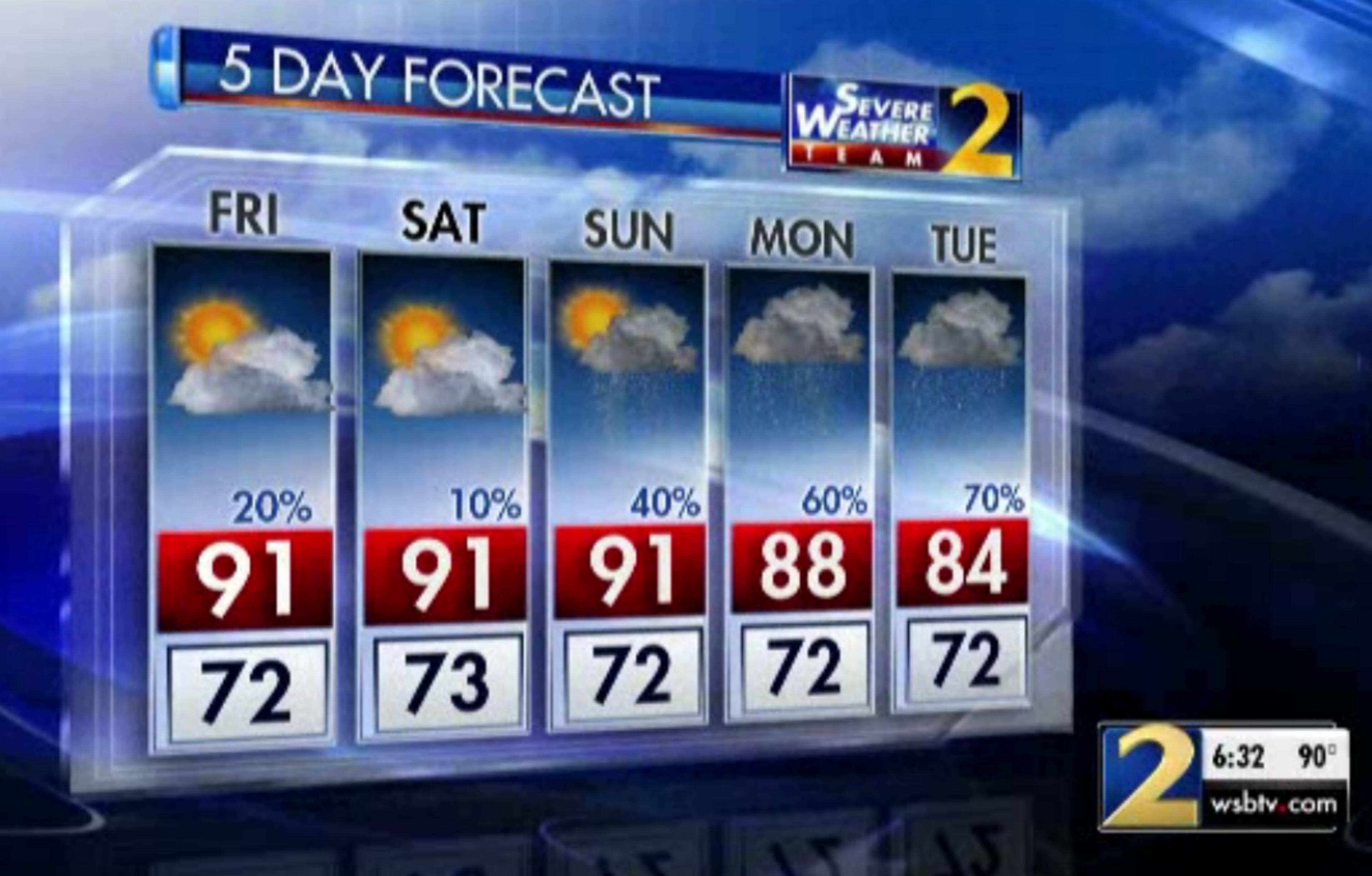 The expected high Friday is 91 degrees, according to the latest forecast from Channel 2. It’s currently 90 in Atlanta.