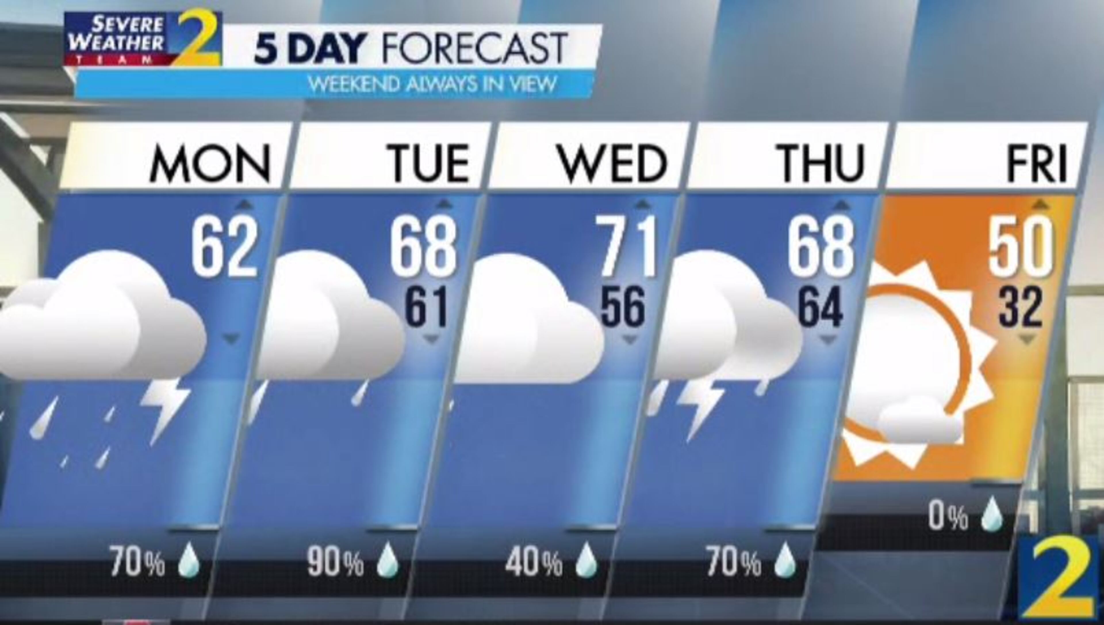 Wednesday’s rain chance is 40%, and Thursday’s 70% chance could also bring strong storms and the possibility for severe weather, according to Channel 2.