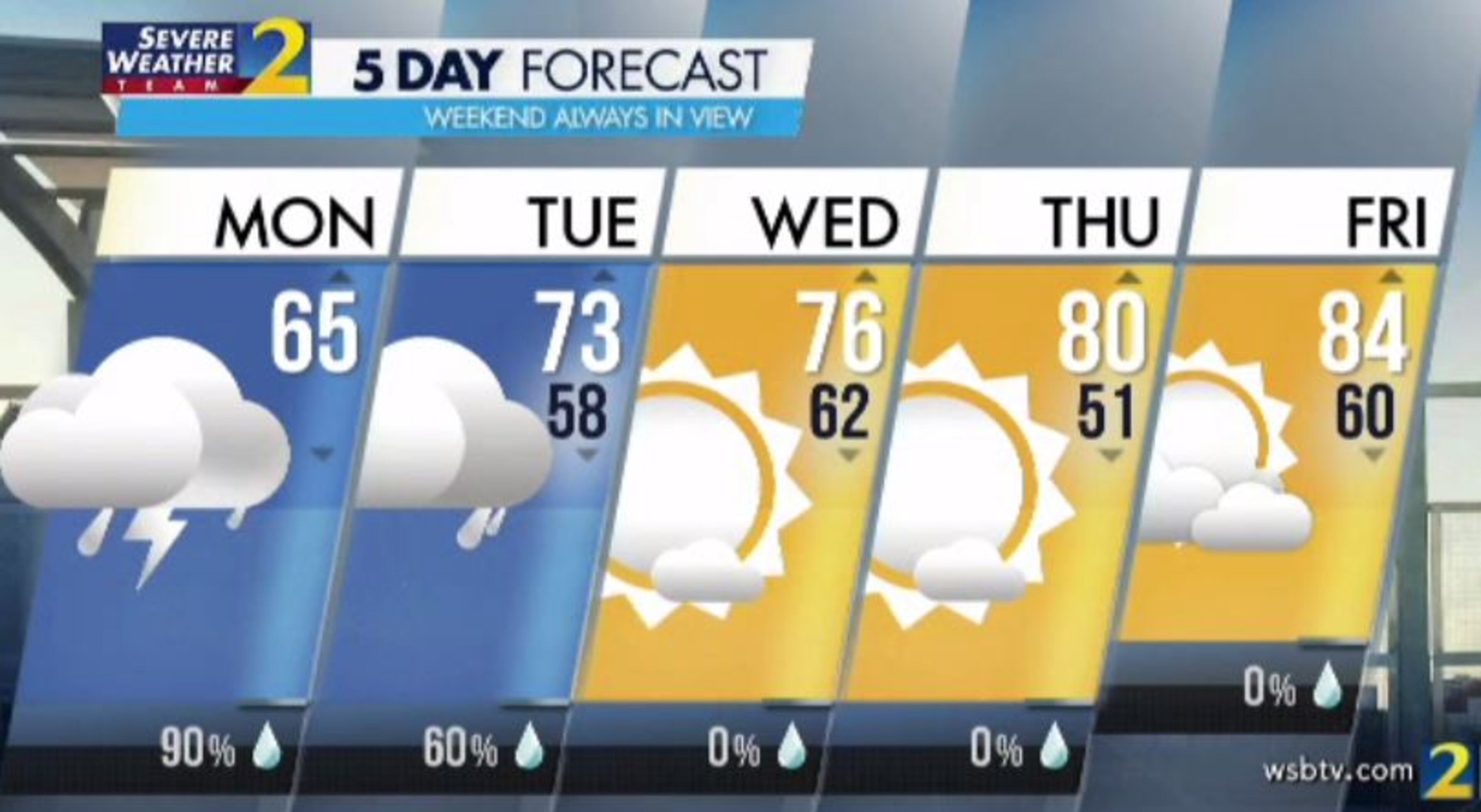 Monday should be the chilliest day of the week with a projected high of 65 degrees. Nitz said it will be warmer to the south and west of Atlanta with afternoon highs near 70, but a cool northeast breeze will keep the mountains cooler in the upper 50s.