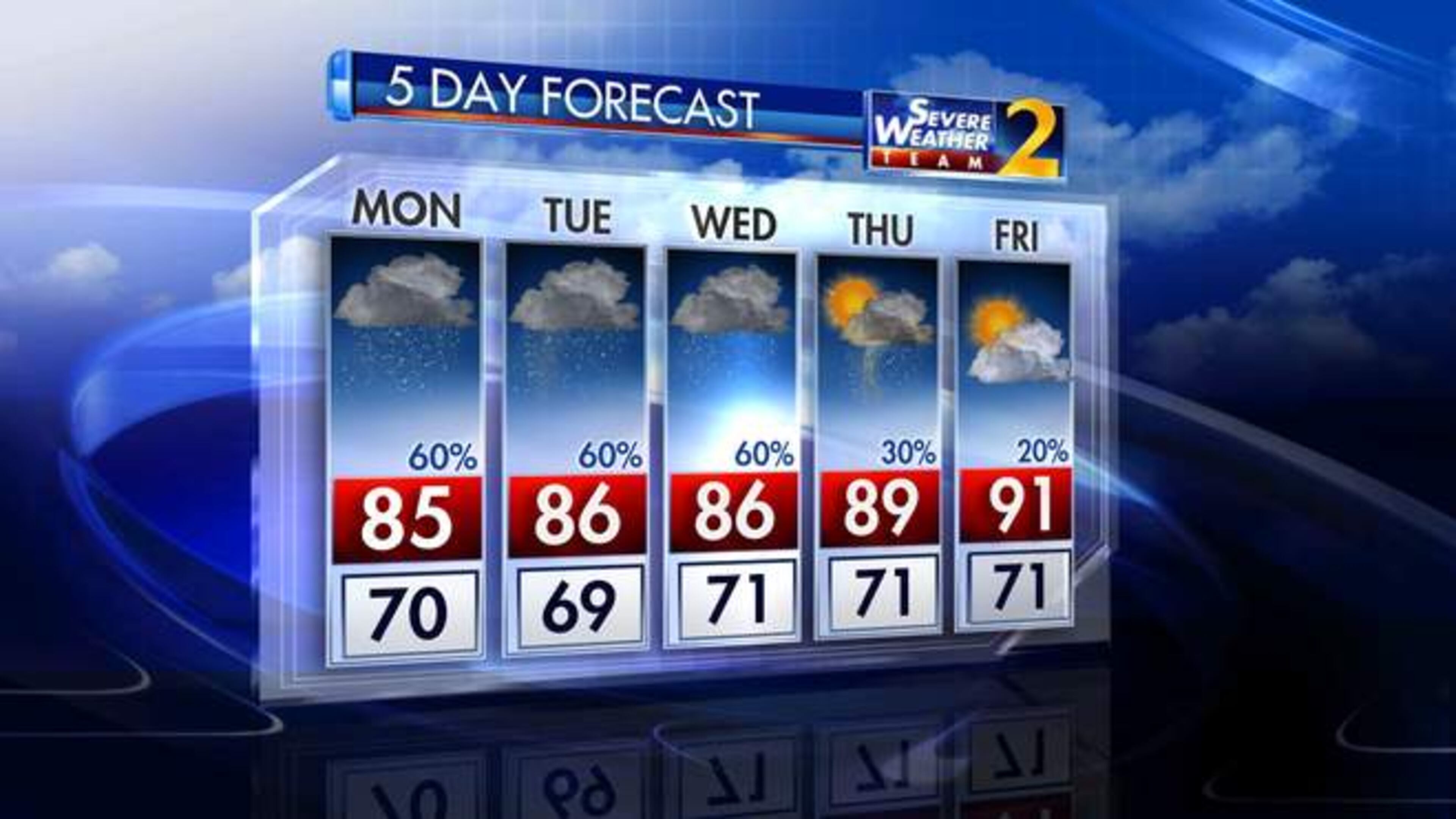 Clouds and rain will keep our temperatures down in the mid 80s, about 4° below average.