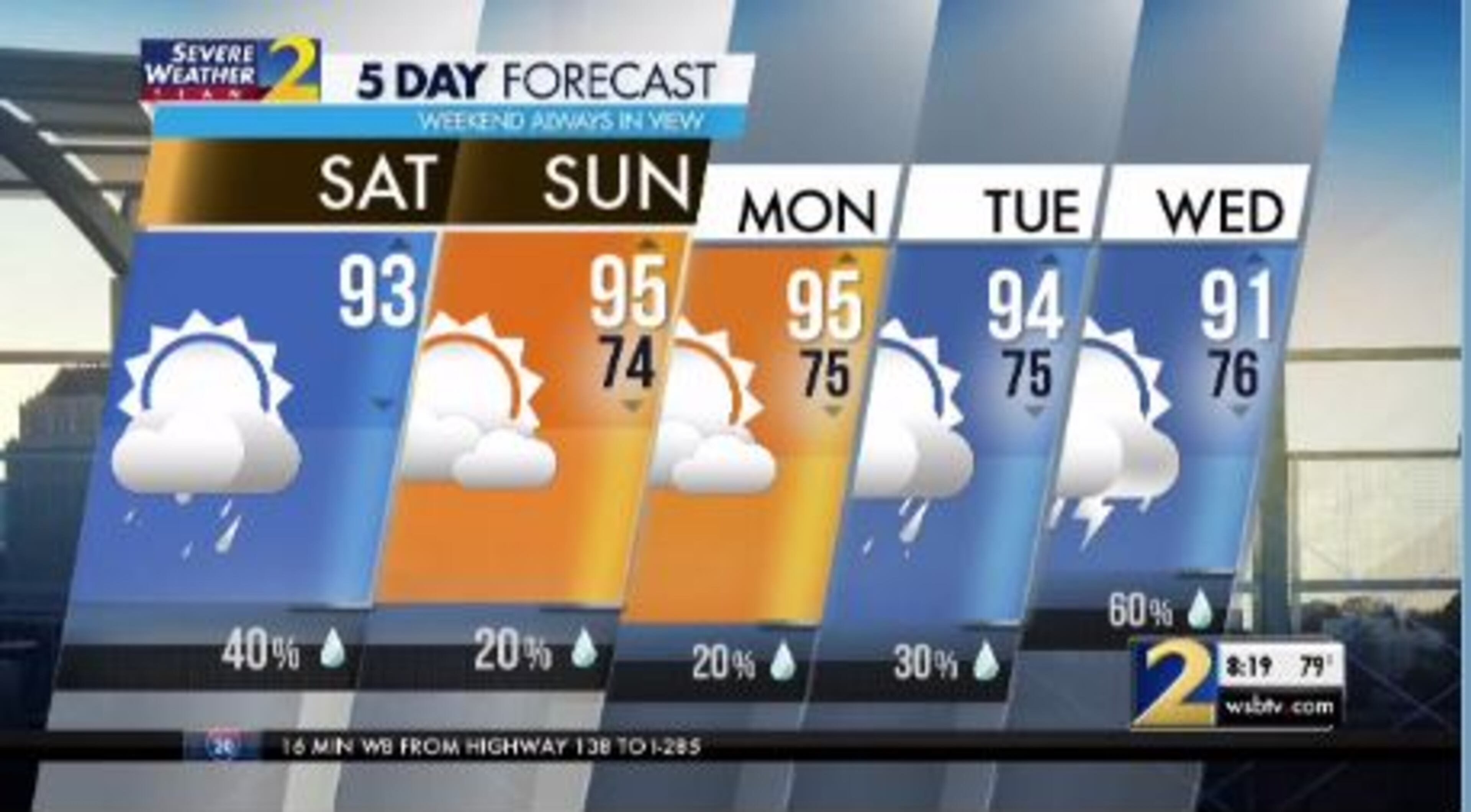Sunday should be drier, with just a 10% chance of rain. Unfortunately ,that also means temperatures will ramp back up into the mid-90s. Those planning on attending the Atlanta United match against New York City FC on Sunday afternoon may want to plan on a warm trip to and from Mercedes-Benz Stadium. Kick off is set for 3:55 p.m.