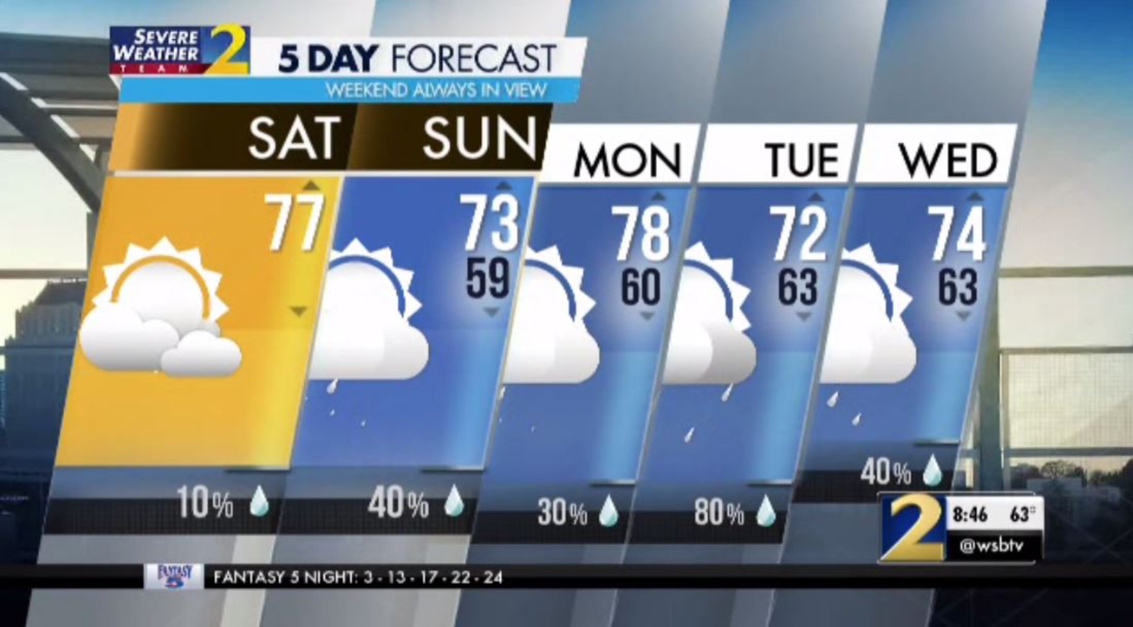 Saturday should be cool and dry, with just a 10% chance of showers as Atlanta enjoys one more day of dry air, Channel 2 Action News meteorologist Glenn Burns said.