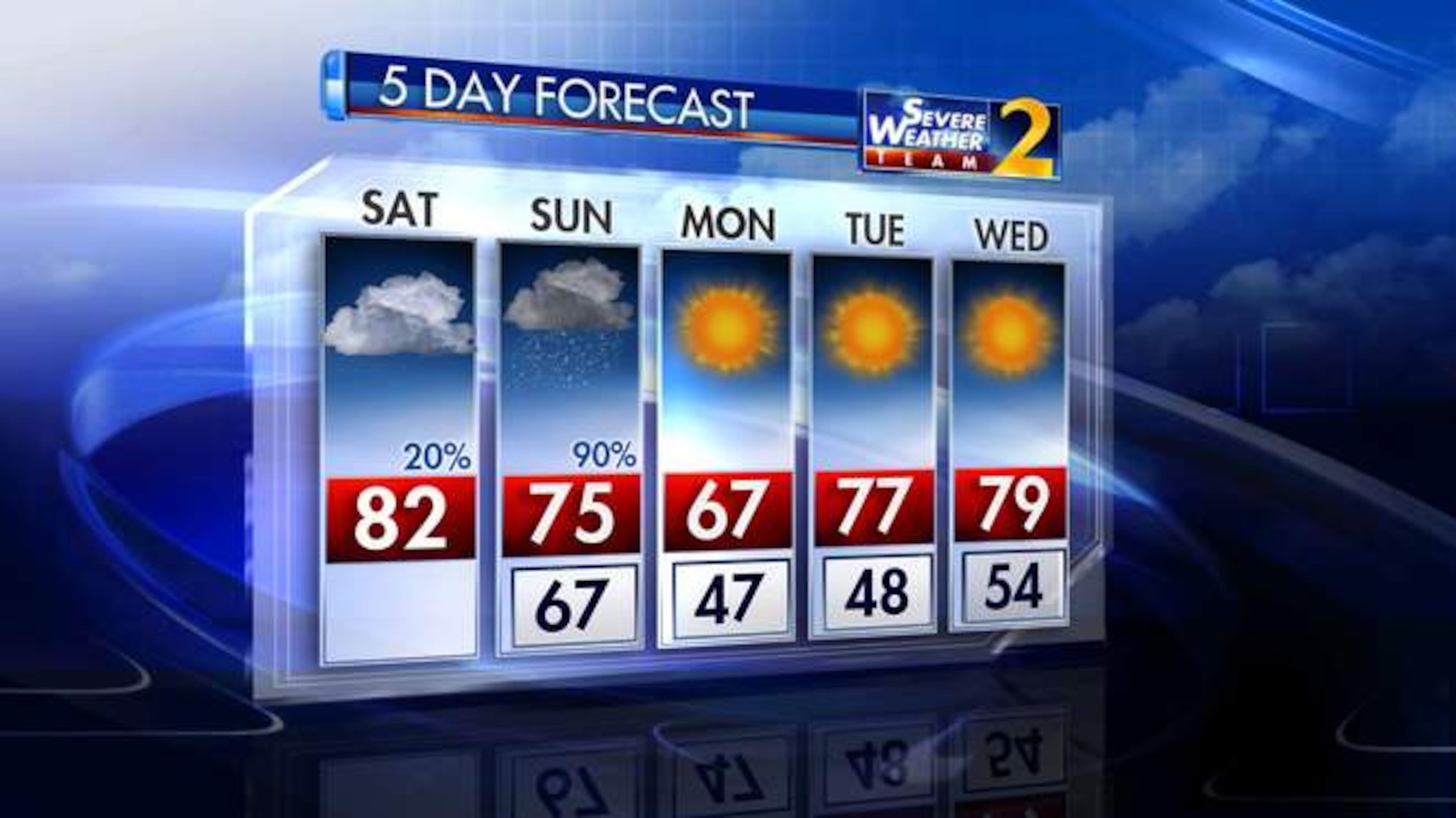 Saturday should be cloudy and dry with a high of 82 degrees and only a 10 percent chance of rain. However, the threat of potentially severe weather will most likely sully Sunday afternoon.