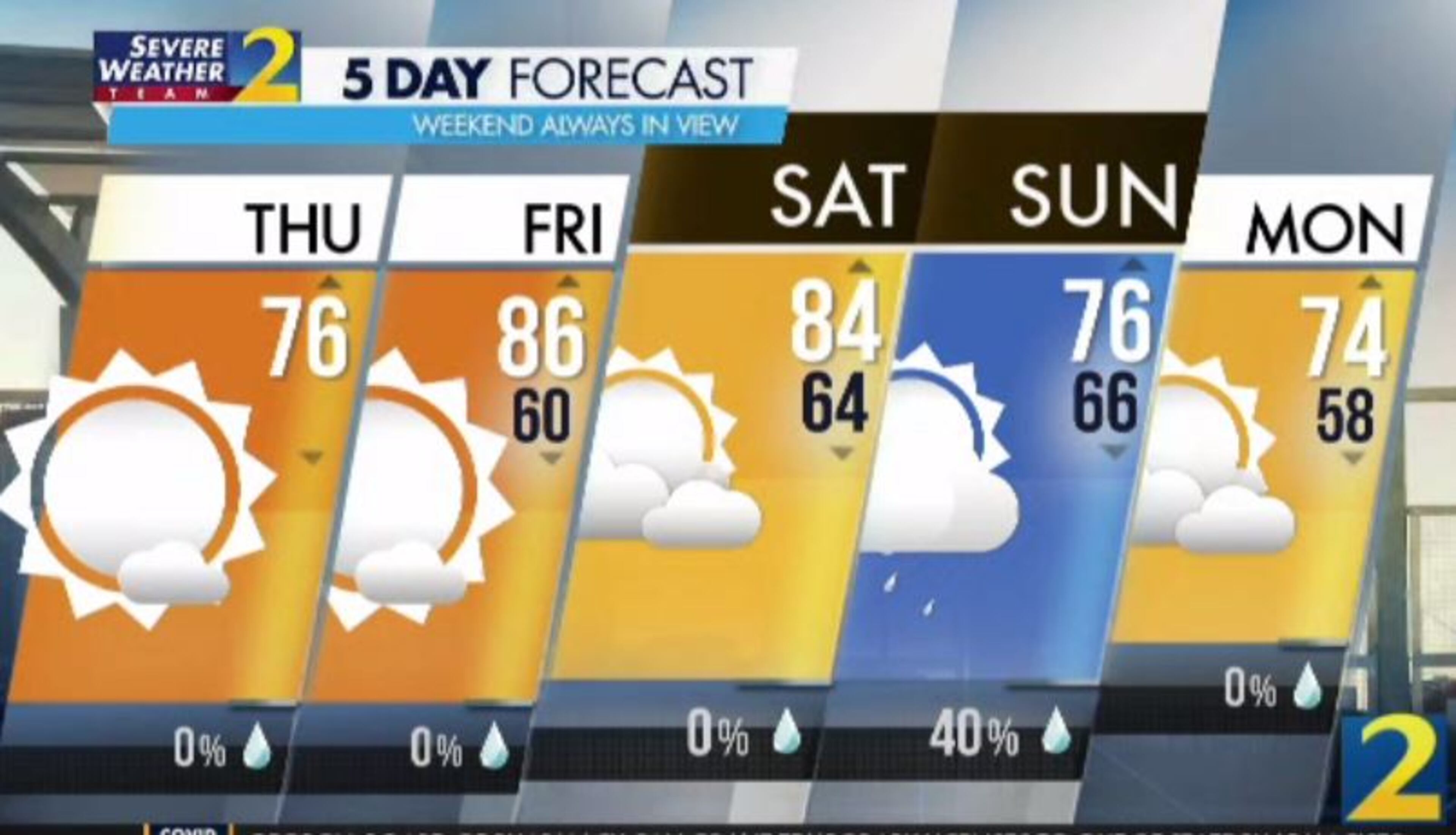 Temperatures in the 40s and 50s across the region will make it up into the 70s Thursday, according to Channel 2 Action News. Some areas of metro Atlanta could see afternoon highs in the upper 70s.