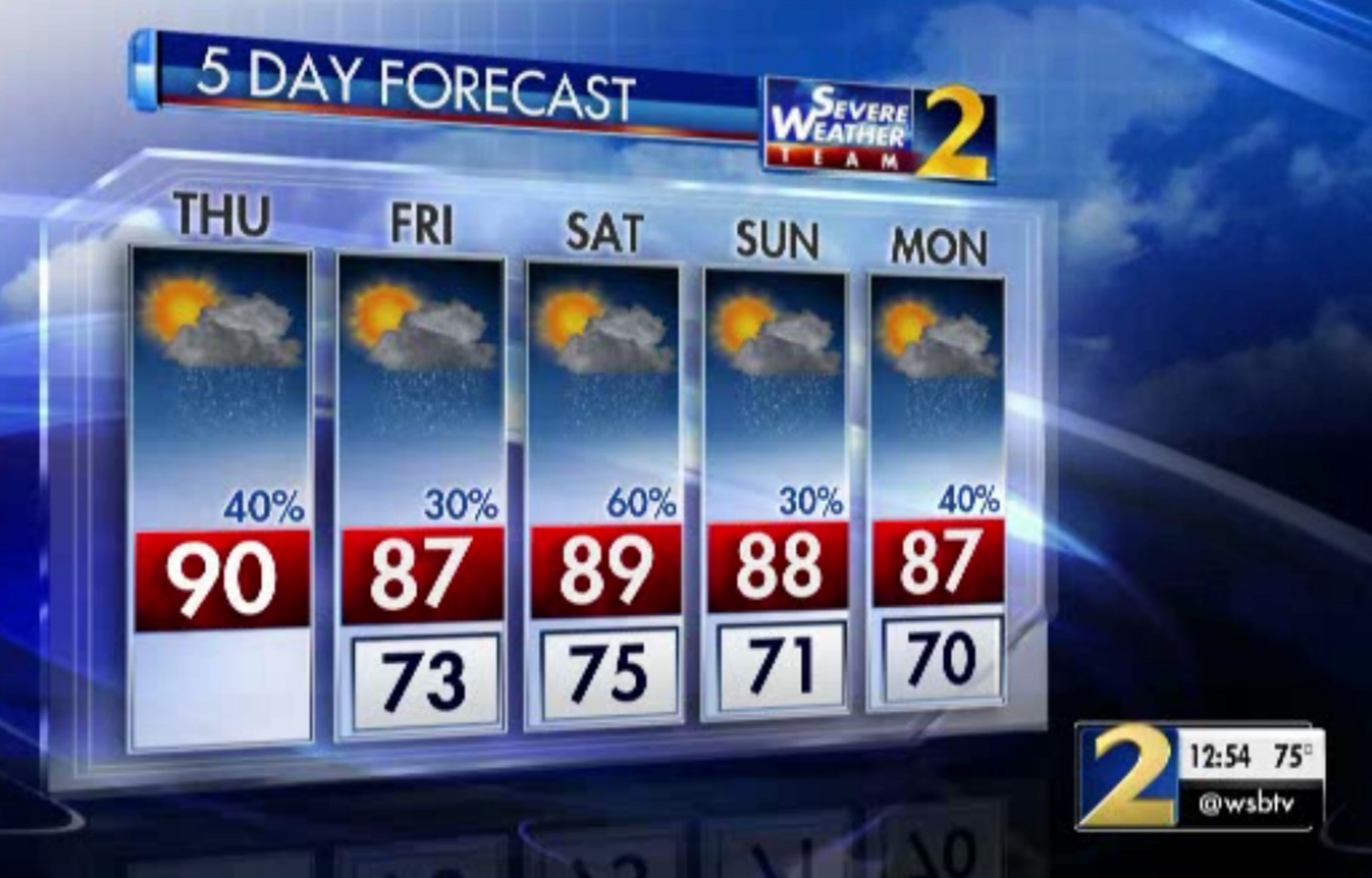 A lower 40 percent chance of rain won’t help drop the temperature much, Channel 2 meteorologist Karen Minton said. Thursday’s predicted high is 90 degrees, and it’ll remain in the upper 80s through the weekend.