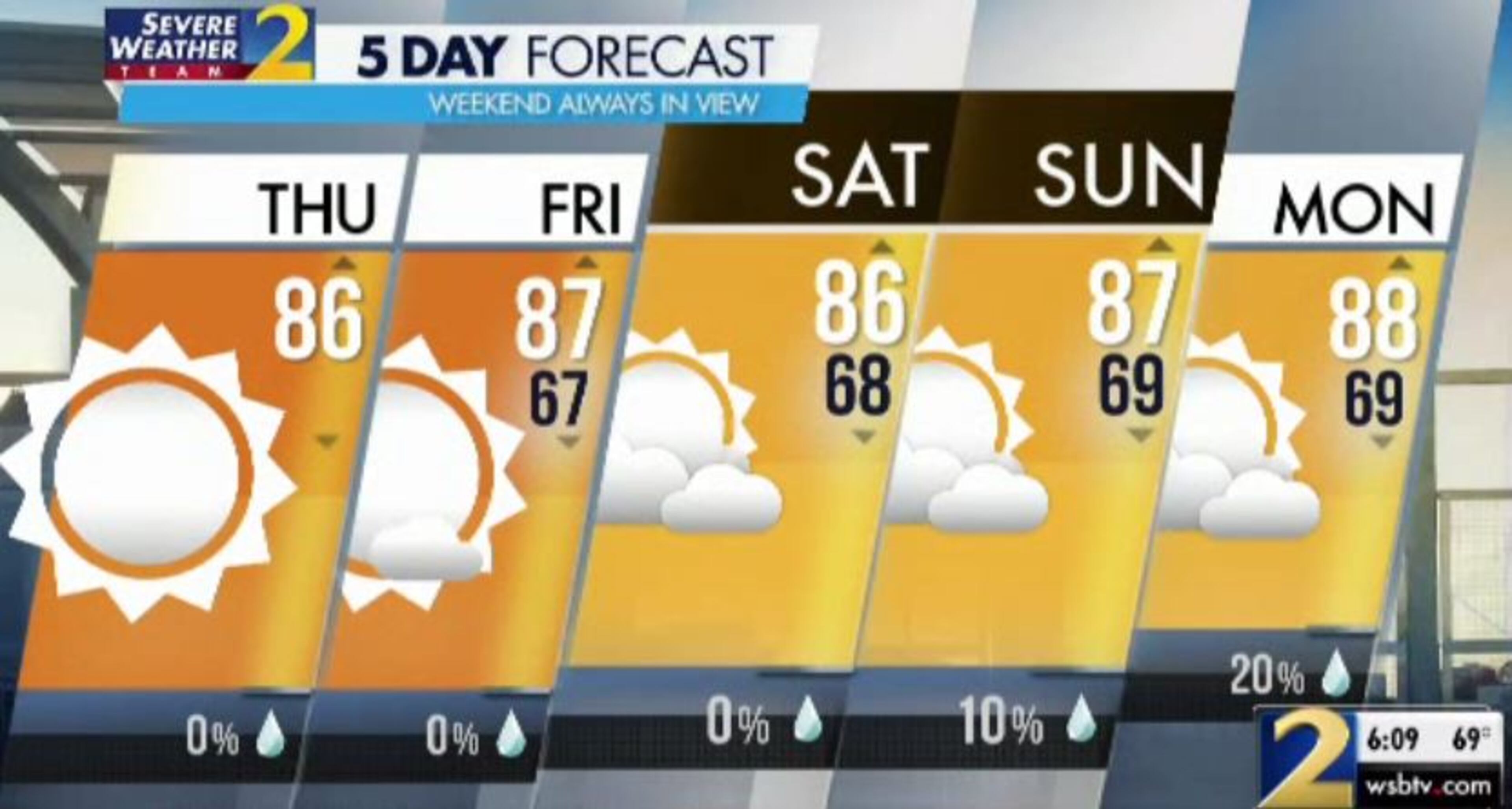 There is a 10% chance of an isolated shower Sunday, but Monahan said it won’t do much to dampen weekend plans. Higher rain chances return to North Georgia next week, he said.