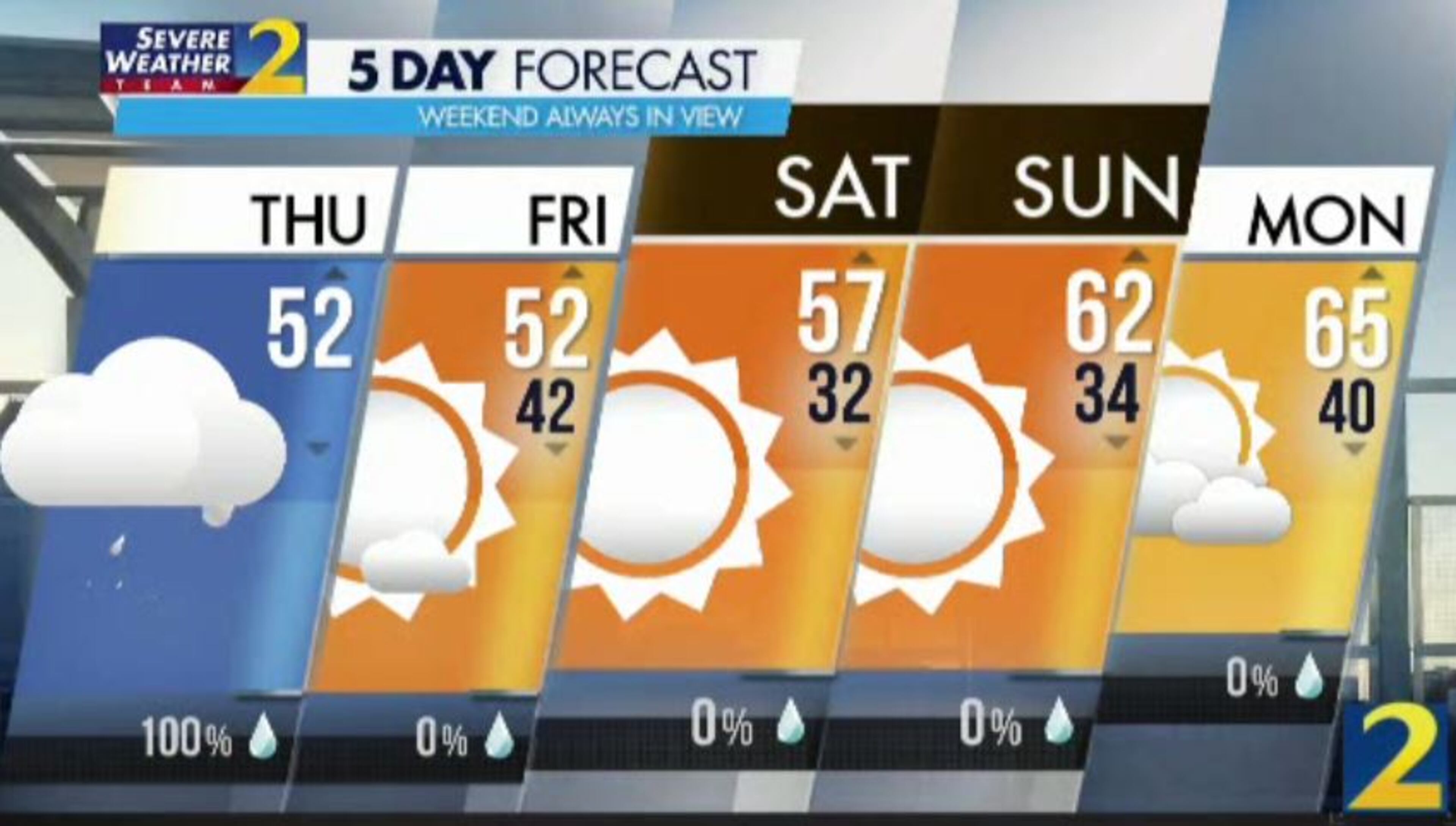 It’s a whole different story Friday, which should get lots of sunshine and afternoon highs in the low 50s, according to Channel 2. Friday is the start of a much drier weather pattern that will see North Georgia into next week.
