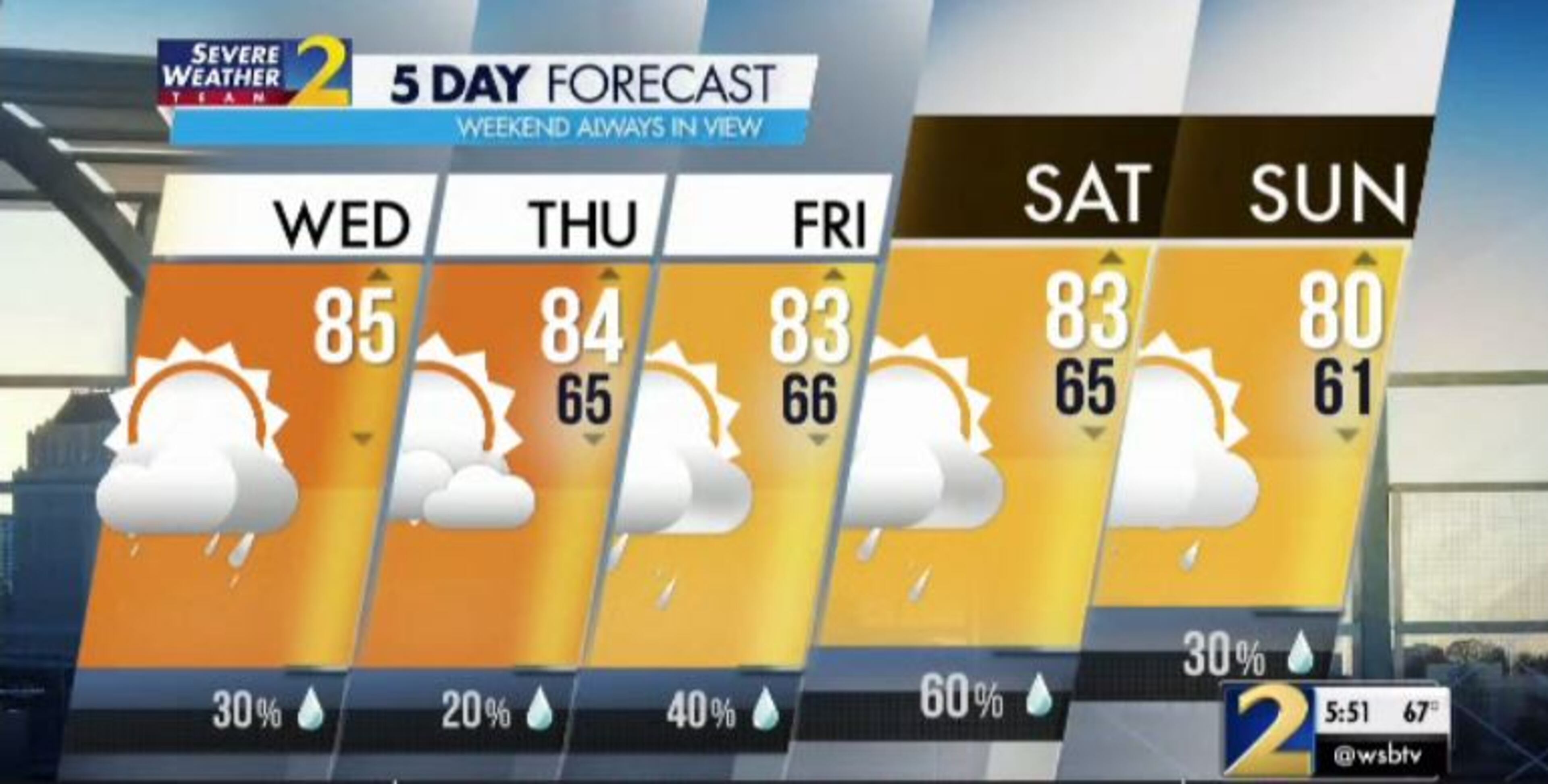 After a 40 percent chance of rain Friday, Saturday will see a 60 percent chance of widespread scattered showers and storms by the afternoon, according to Channel 2. Sunday should be a little drier with a 30 percent chance of rain.