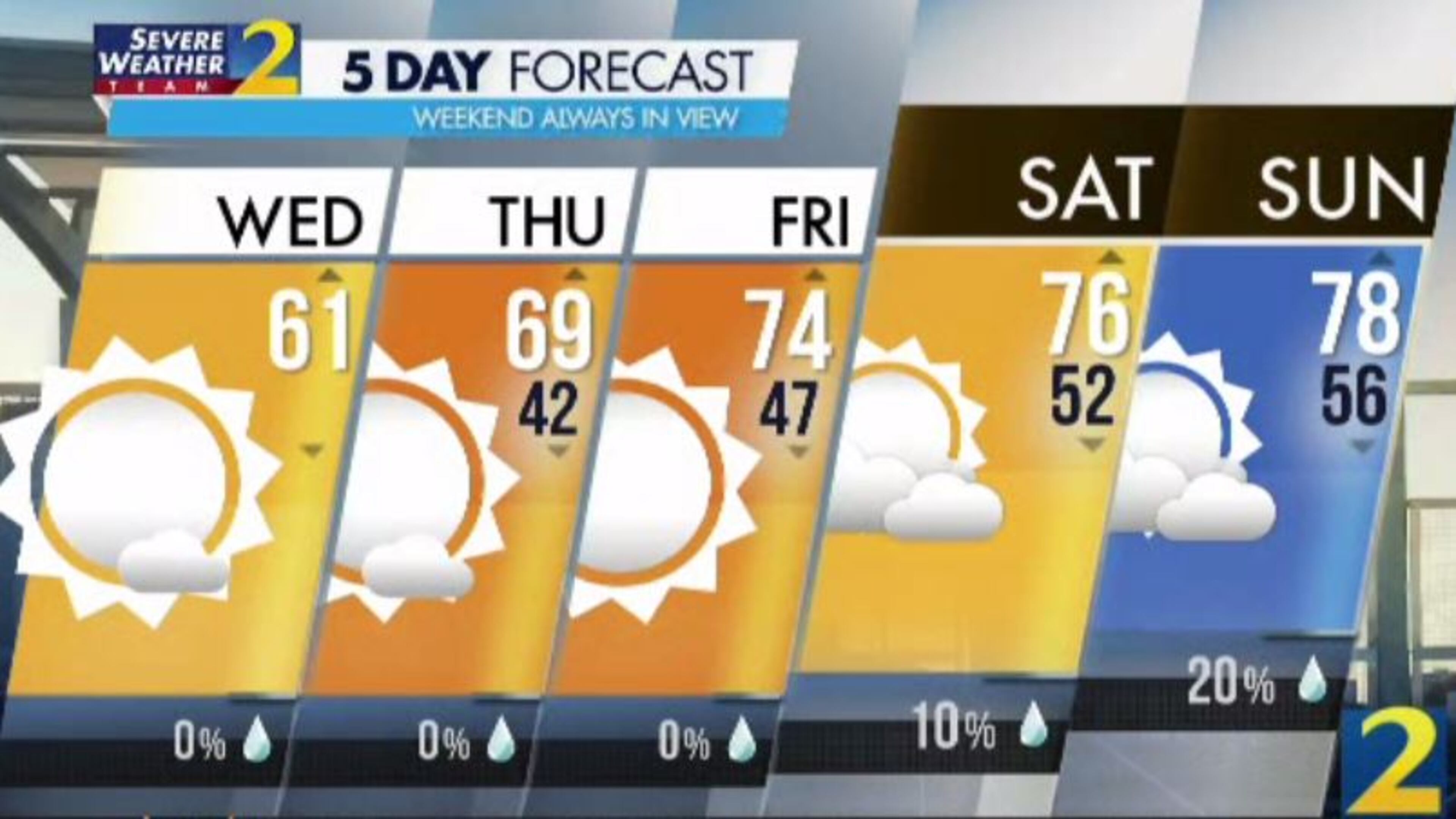 A return to the upper 70s this weekend comes with a small chance for rain on Sunday, according to Channel 2.